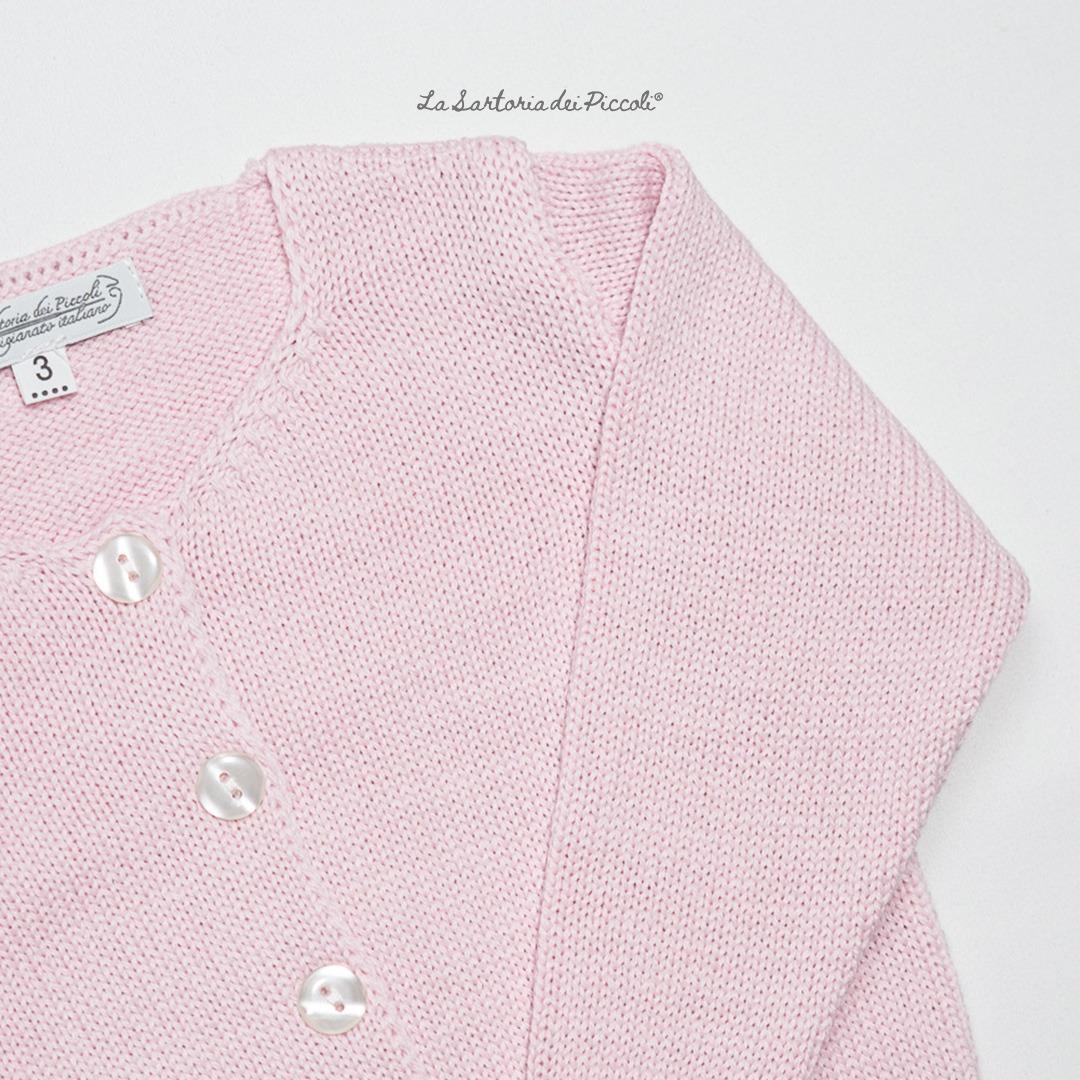 Maglioncino realizzato in morbido e puro tricot di cotone rosa, chiusura centrale con bottoncini, colore rosa