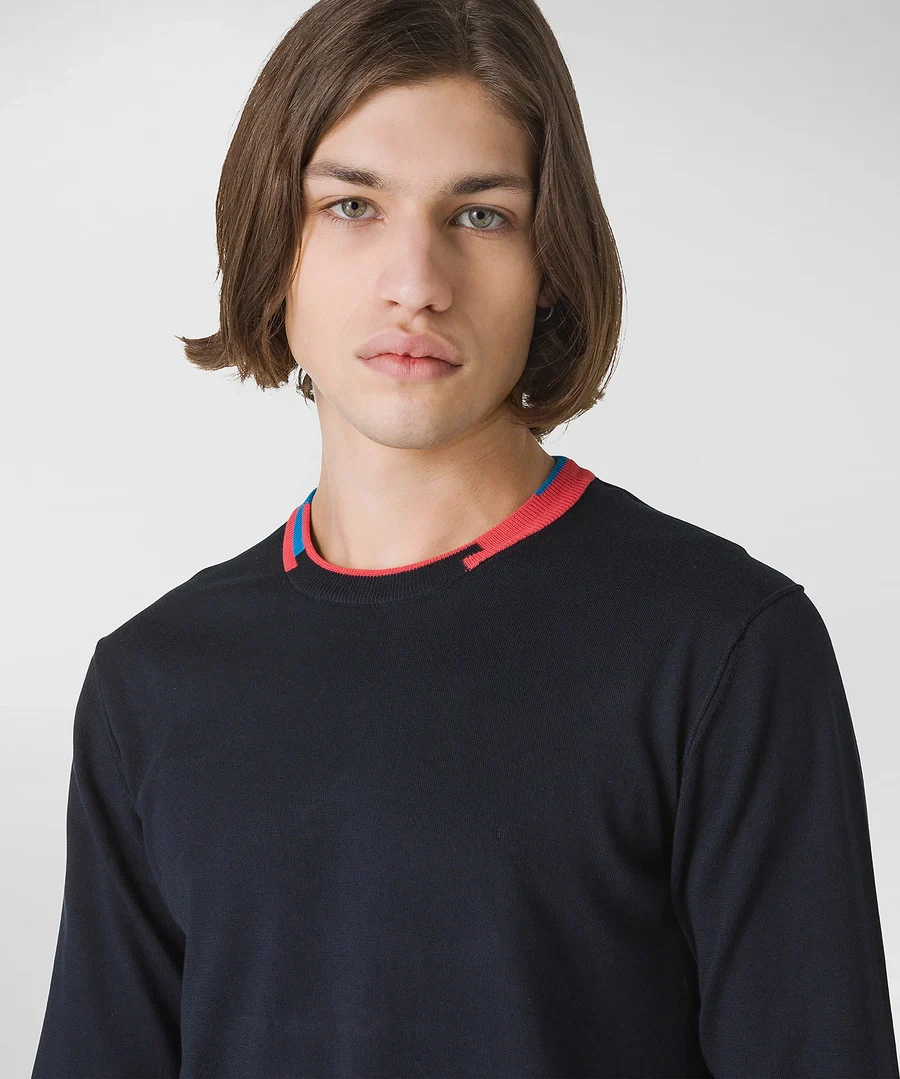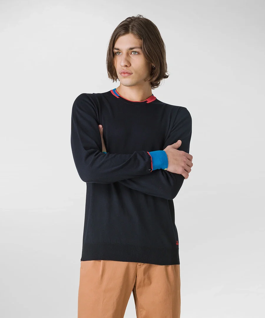 Maglia girocollo Peuterey uomo, modello in tricot di cotone, inserti colorati in contrasto su collo e polsini, colore blu scuro