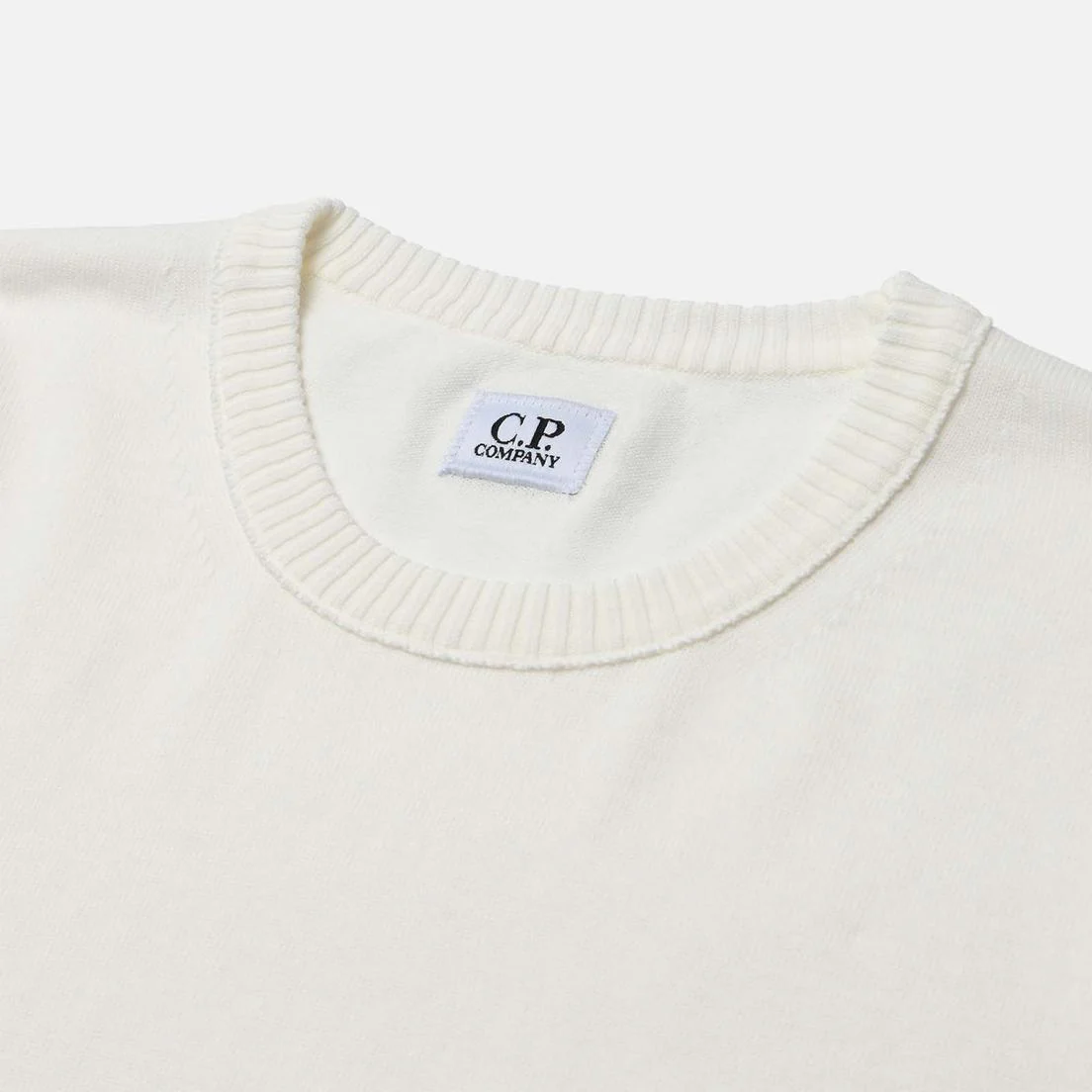 Maglioncino CP Company, modello girocollo, realizzato in crepe di cotone dalla texture increspata, taschino con lente, polsino e orlo a costine, vestibilità regular, colore bianco
