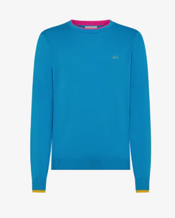Maglioncino Sun68, modello girocollo con contrasto interno, maniche lunghe, dettaglio logo ricamato in contrasto sul petto, colore azzurro