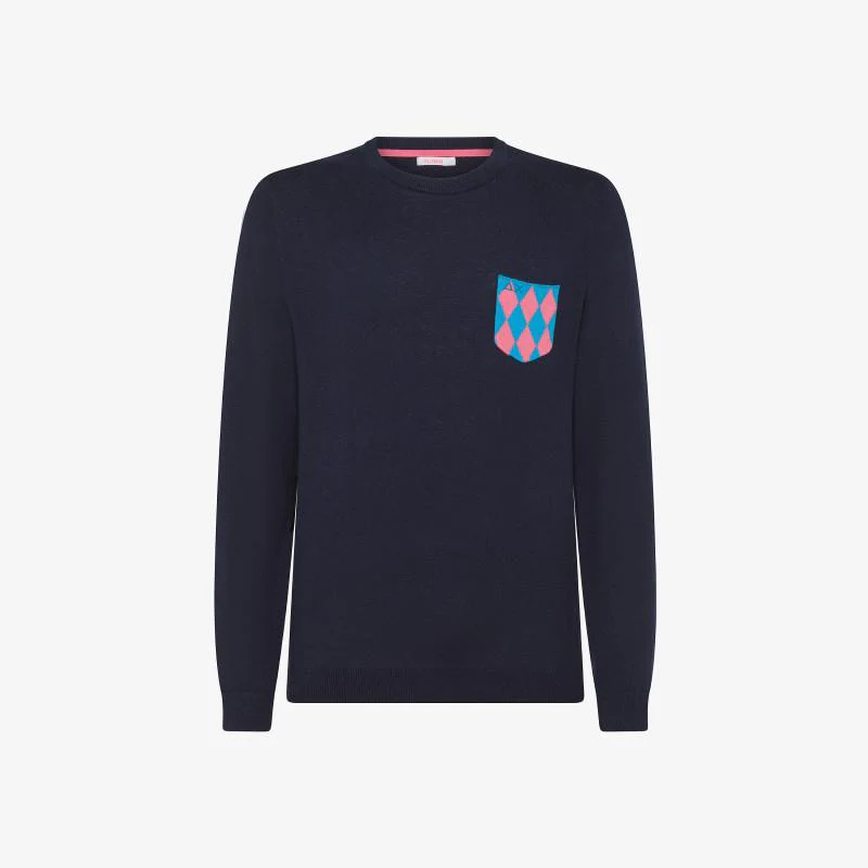 Maglioncino in lana e cotone Sun 68, modello girocollo e maniche lunghe, taschino in contrasto sul petto con motivo a rombi jacquard sul petto, bordi rifiniti, logo sul petto, colore blu