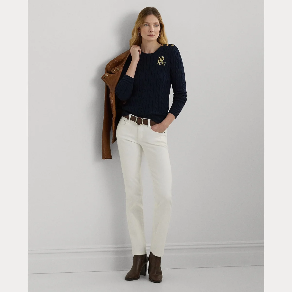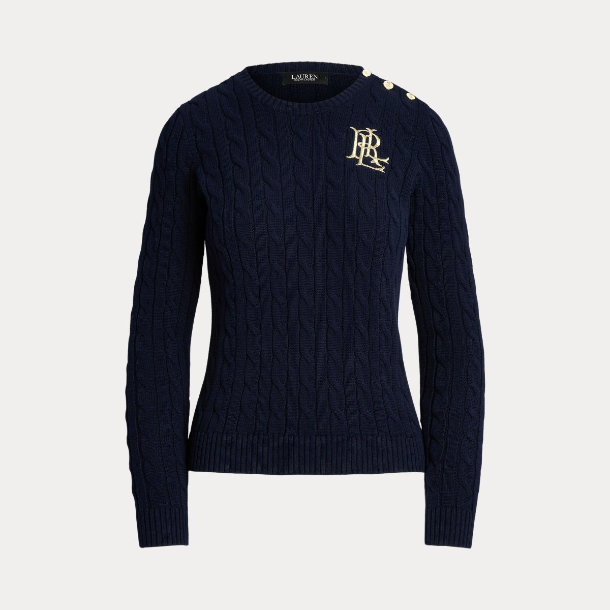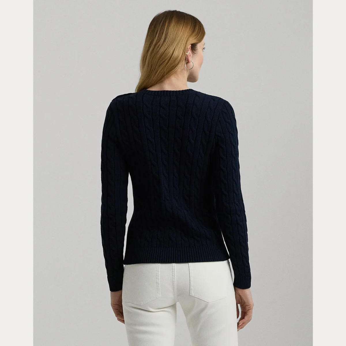 Maglioncino Lauren Ralph Lauren donna, modello girocollo, con dettaglio bottoni logati sulla spalla, logo ricamato in contrasto sul petto, fantasia a trecce, colore blu