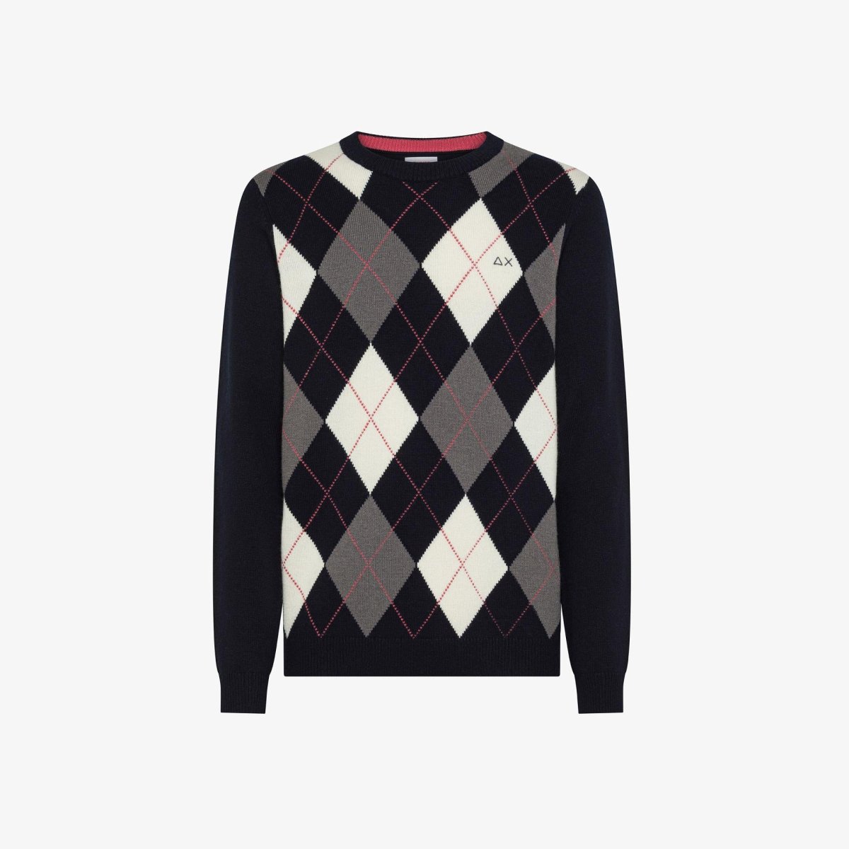 Maglione in lana e cashmere, motivo a rombi jacquard, girocollo, maniche lunghe, bordi a costine, logo sul petto, colore blu