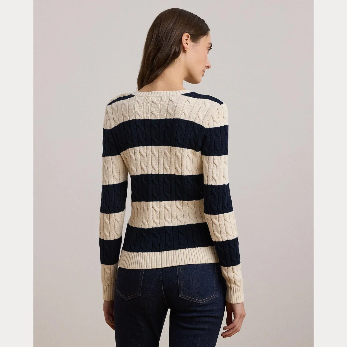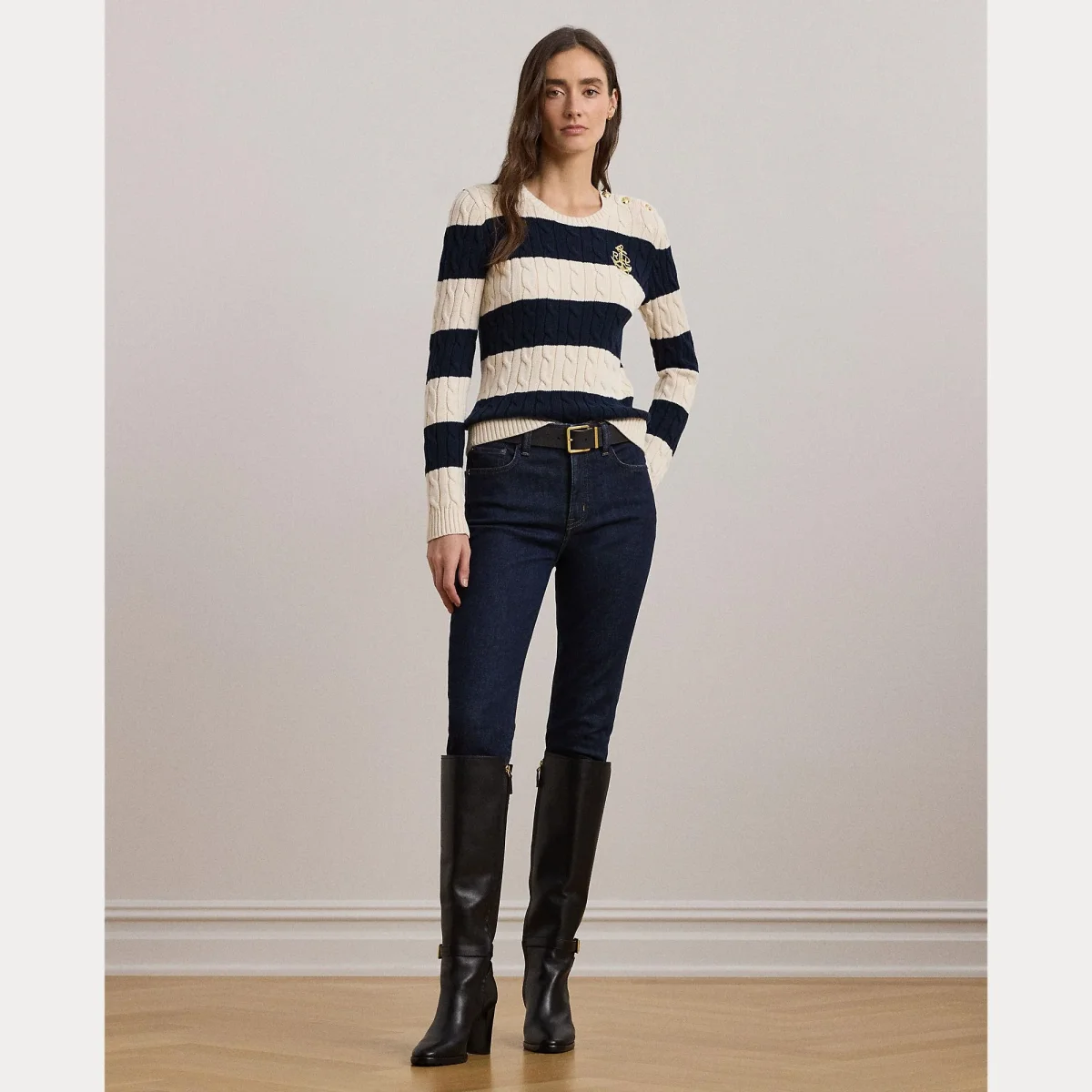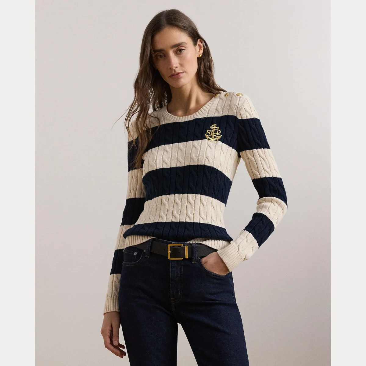 Maglione a trecce e righe con girocollo a coste, maniche lunghe, dettaglio con tre bottoni metallici con stemma in rilievo sulla spalla, logo ricamato in contrasto, vestibilità aderente