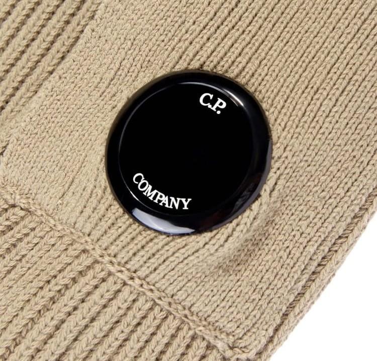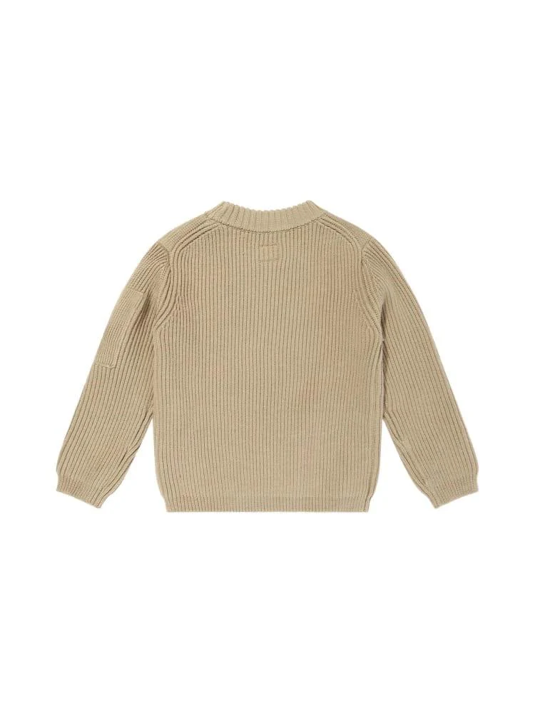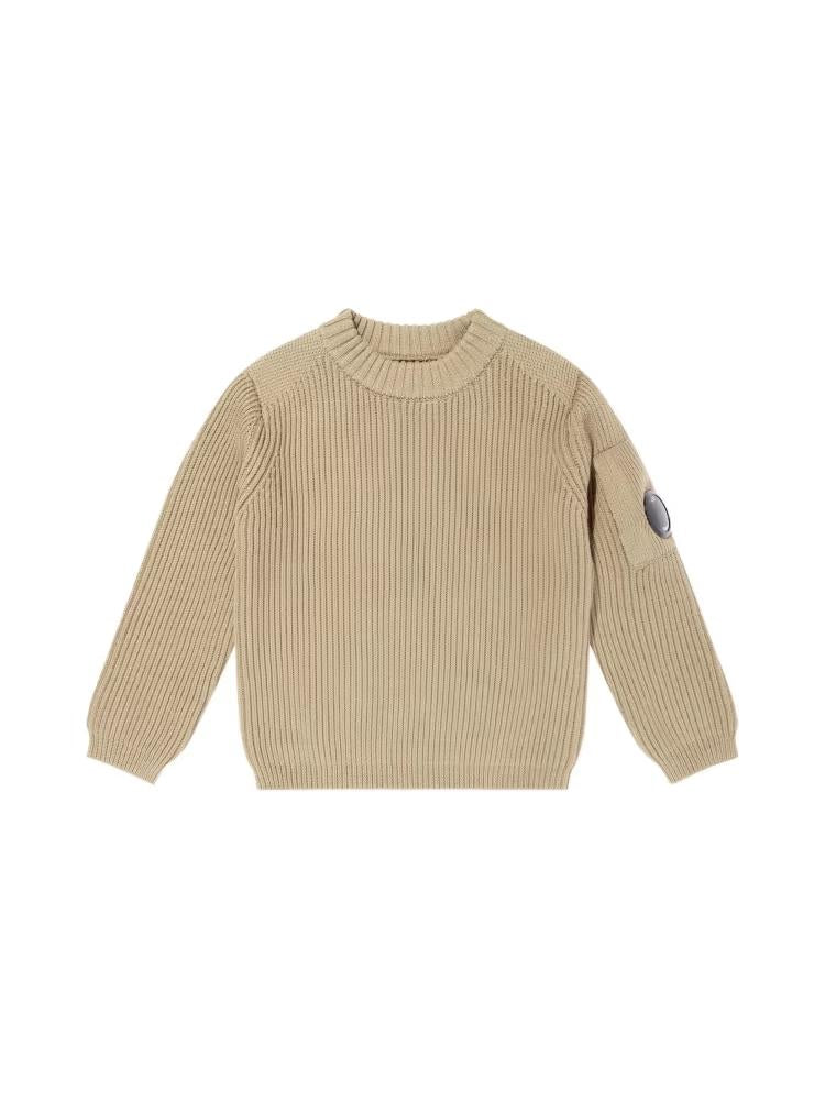 Maglione CP Company Kids, modello girocollo e maniche lunghe, dettaglio con lente iconica in contrasto, color cammello