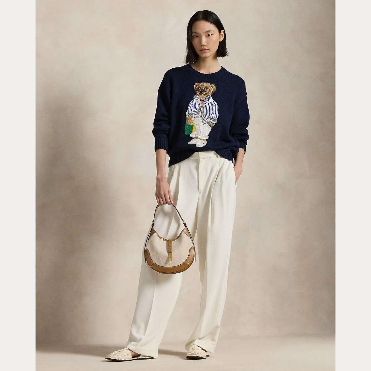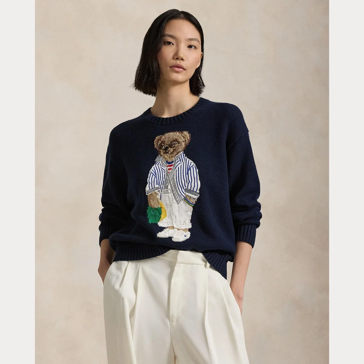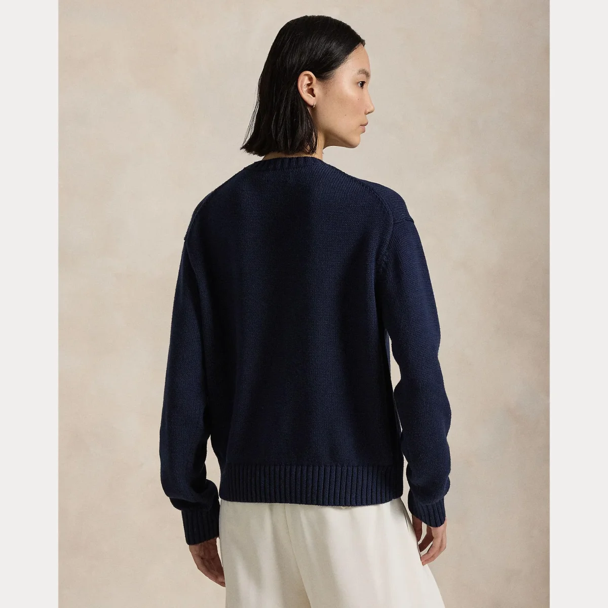 Maglione girocollo Polo Ralph Lauren, modello girocollo, maniche lunghe, dettaglio con iconico Polo Bear in contrasto ricamato, colore blu