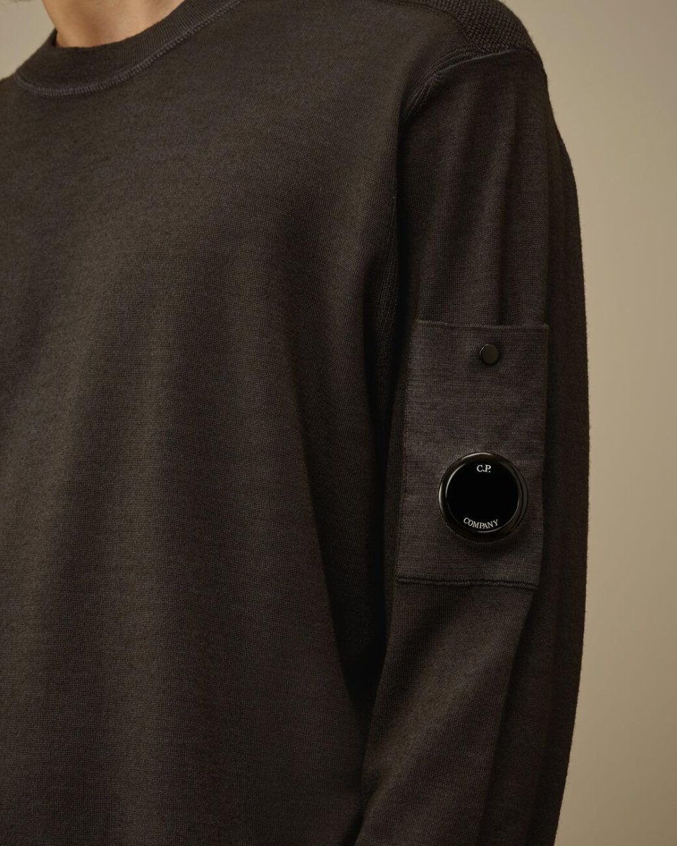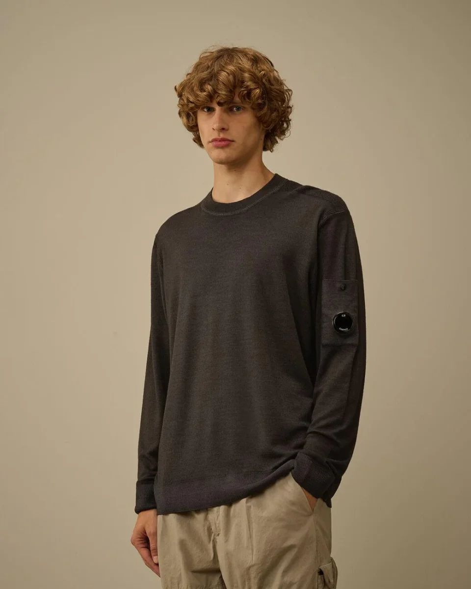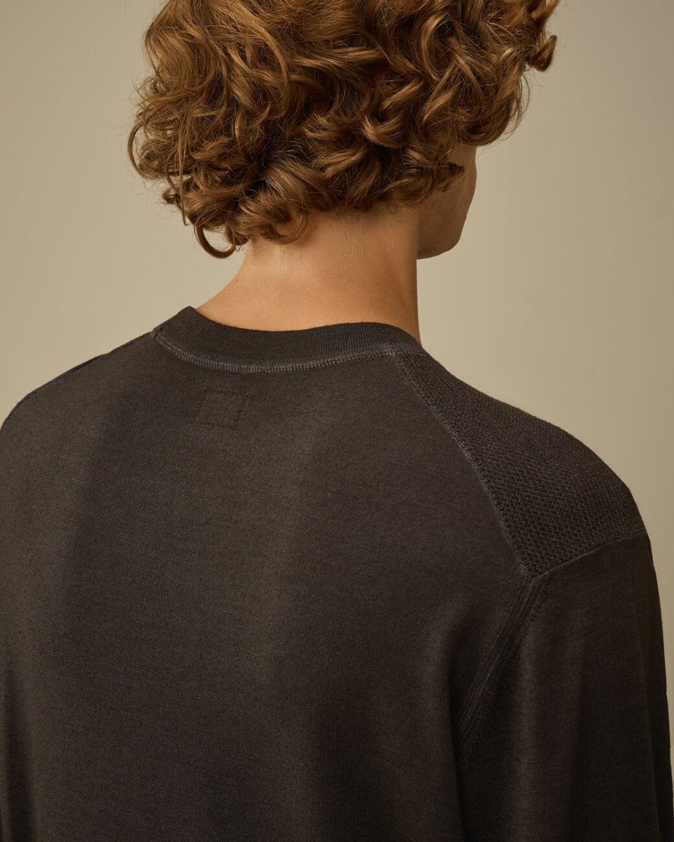 Maglione girocollo, realizzato in lana merino, taschino con lente, cuciture a contrasto, inserti in maglia, regular fit, colore grigio