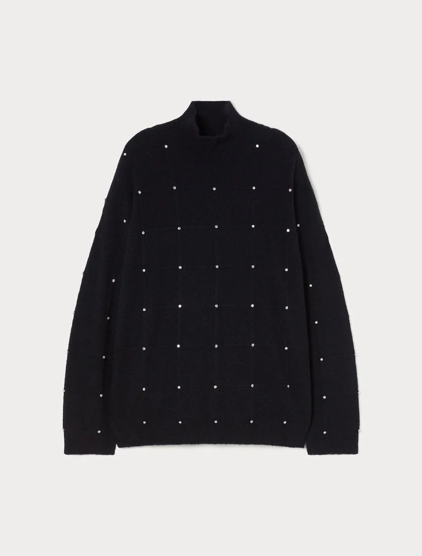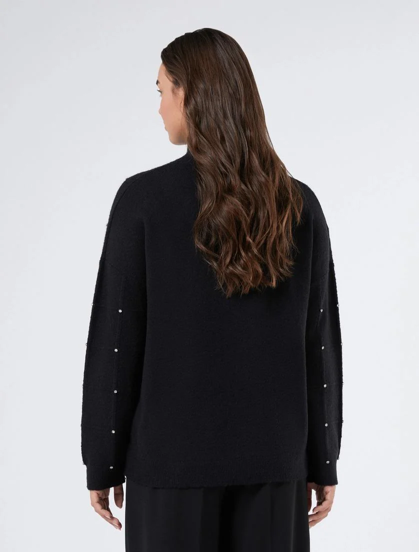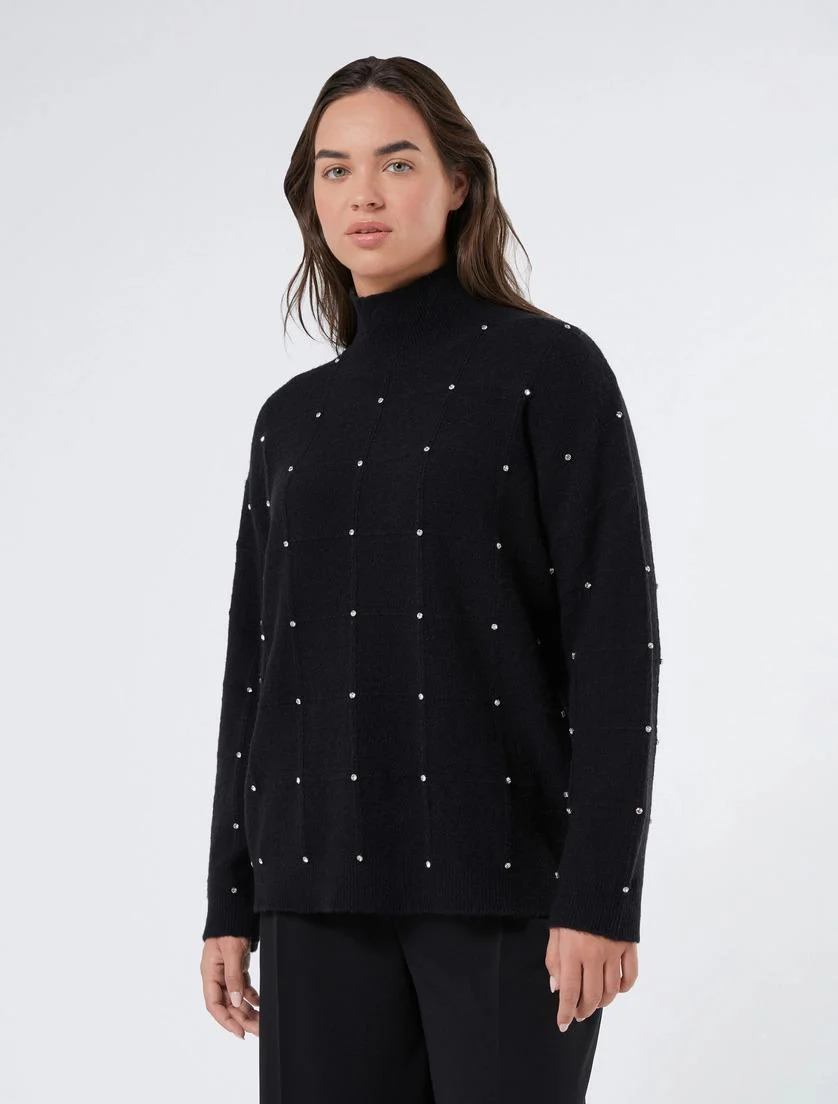 Maglione Now Marina Rinaldi, modello in misto alpaca stretch con strass, collo a lupetto, maniche lunghe e finiture a costine, colore nero