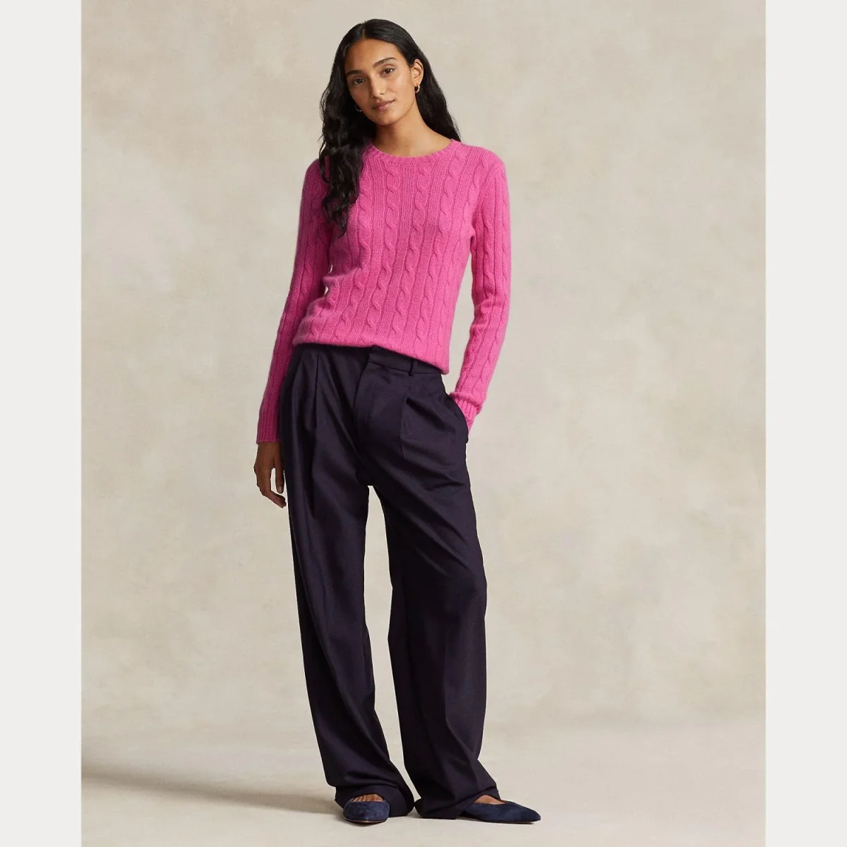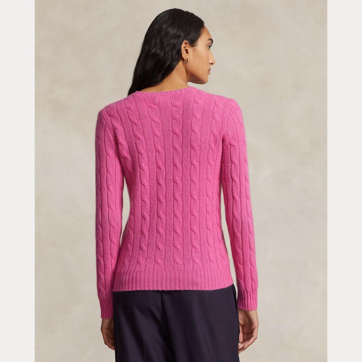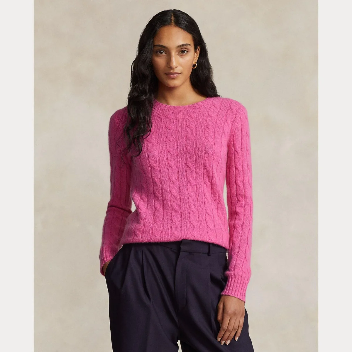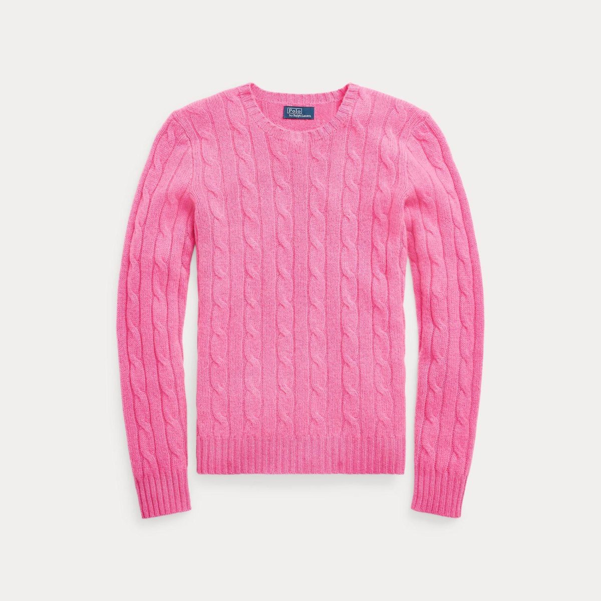 Maglione 100%cashmere Polo Ralph Lauren donna, modello girocollo e maniche lunghe, fantasia a trecce, fondo e polsi a coste, colore rosa