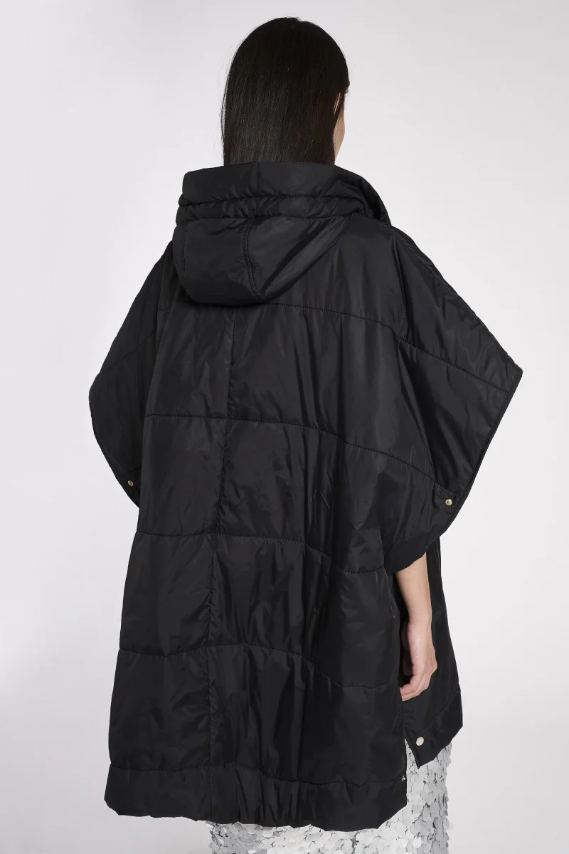 Mantella in nylon foderata e imbottita. Cappuccio con coulisse, allacciatura frontale con lampo di metallo e tasche a filetto. Fianchi chiusi da bottoni automatici in metallo. Lunghezza sotto il ginocchio.
