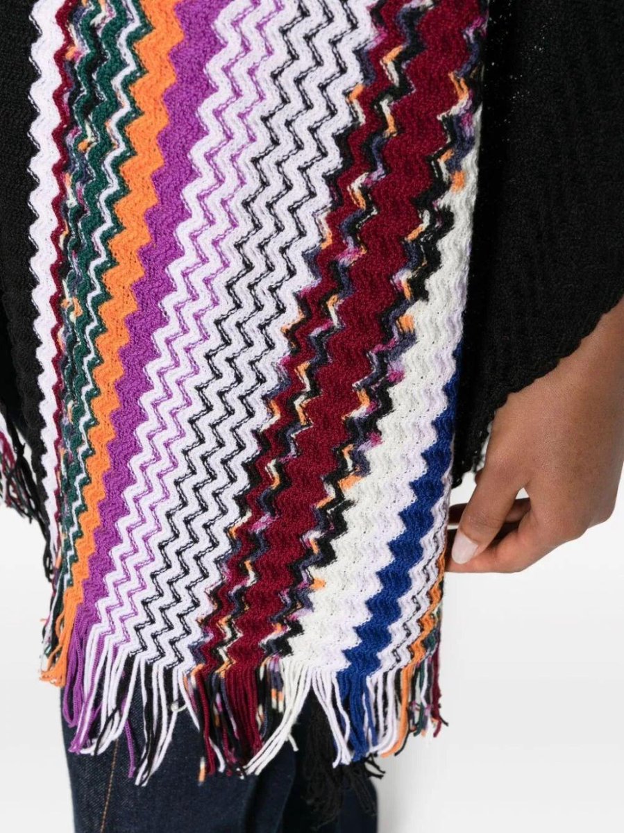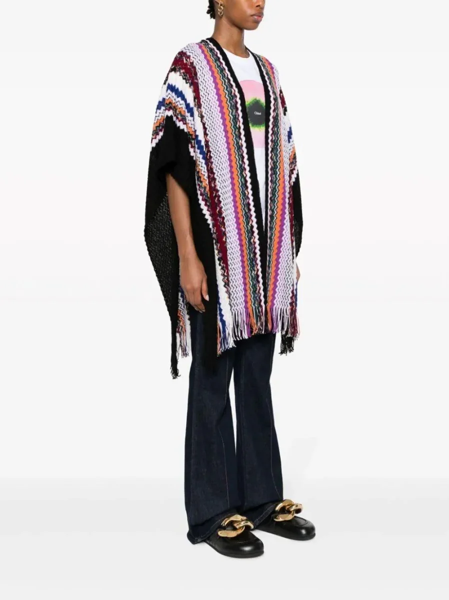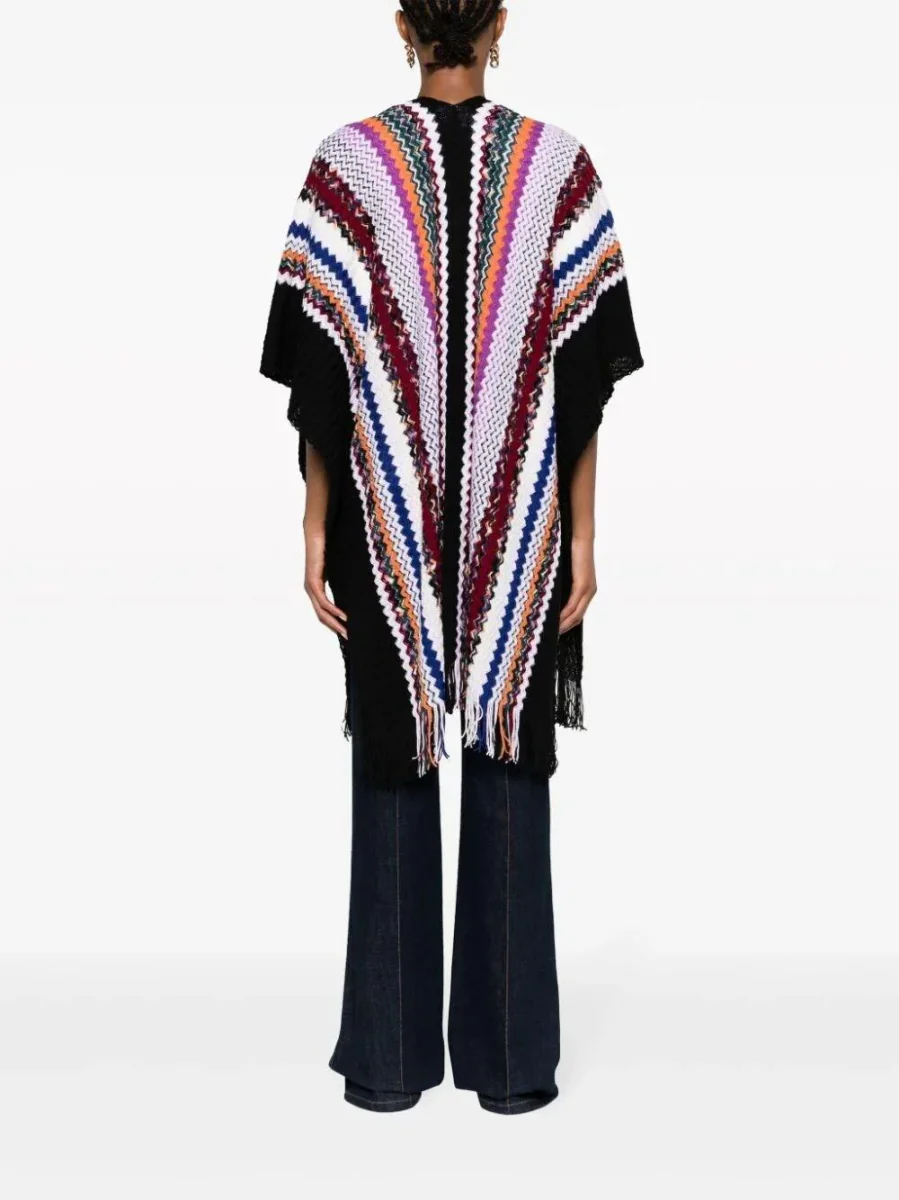 Mantella in maglia Missoni, realizzata con iconica fantasia zig zag Missoni, maniche ampie, apertura frontale, bordo sfrangiato, lunghezza fino alla coscia. Realizzata in lana