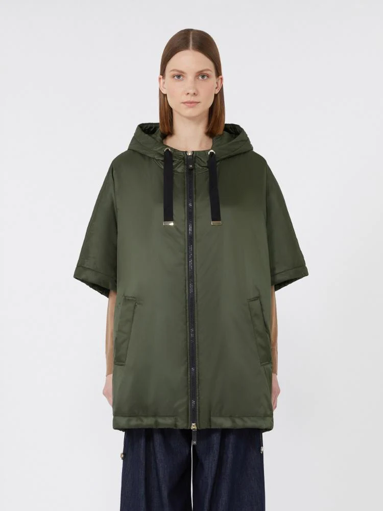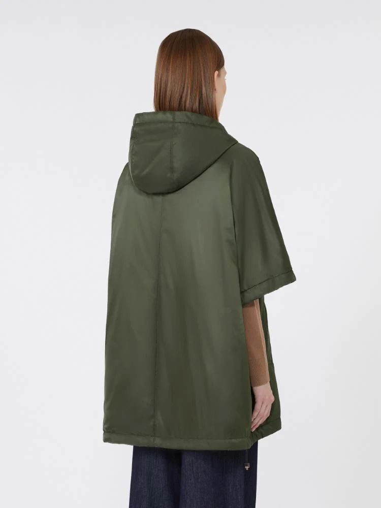 Mantella corta in tela antigoccia con cappuccio con coulisse, maniche corte a kimono, chiusura con zip e cursore, tasche sui fianchi, colore verde