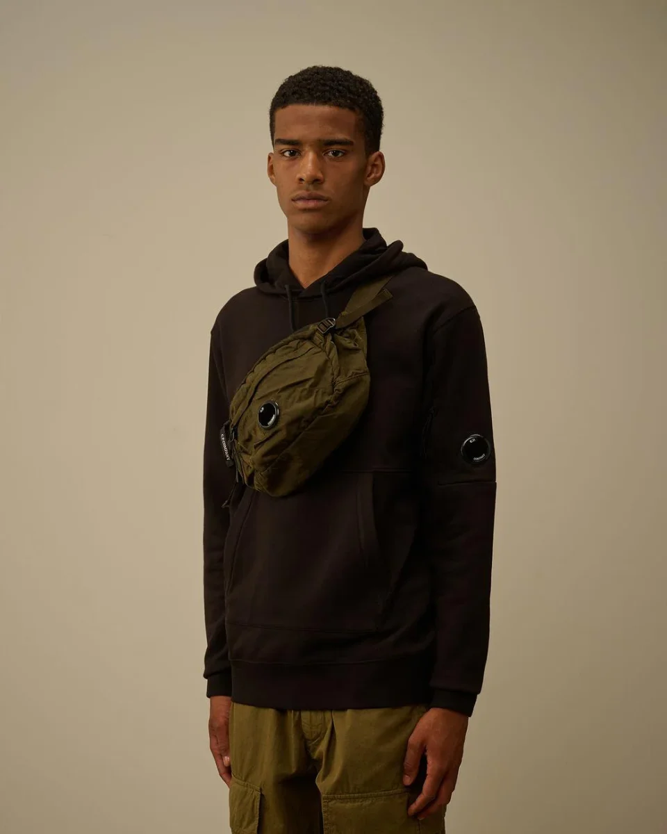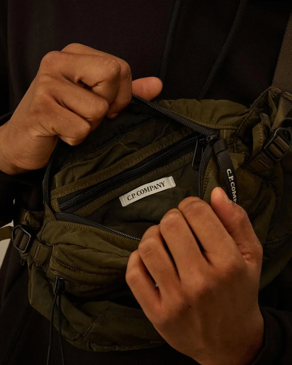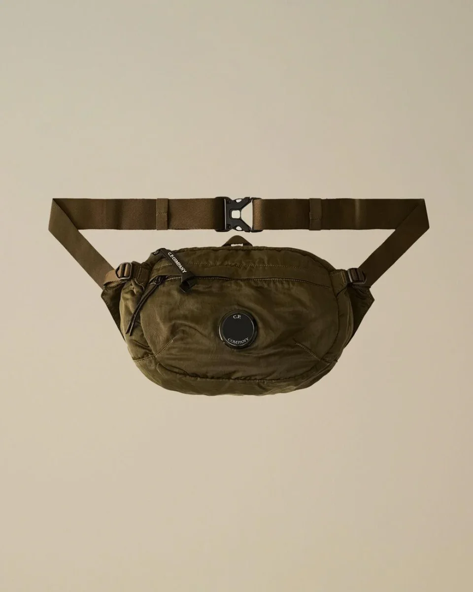 Marsupio a tracolla, realizzato in nylon B, tracolla regolabile con fibbia, impugnatura e tasche esterne con zip, tasca zip e logo, iconica lente in contrasto, chiusura con buckle e strap, colore verde militare