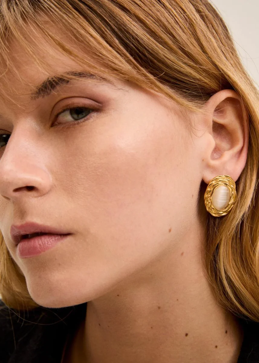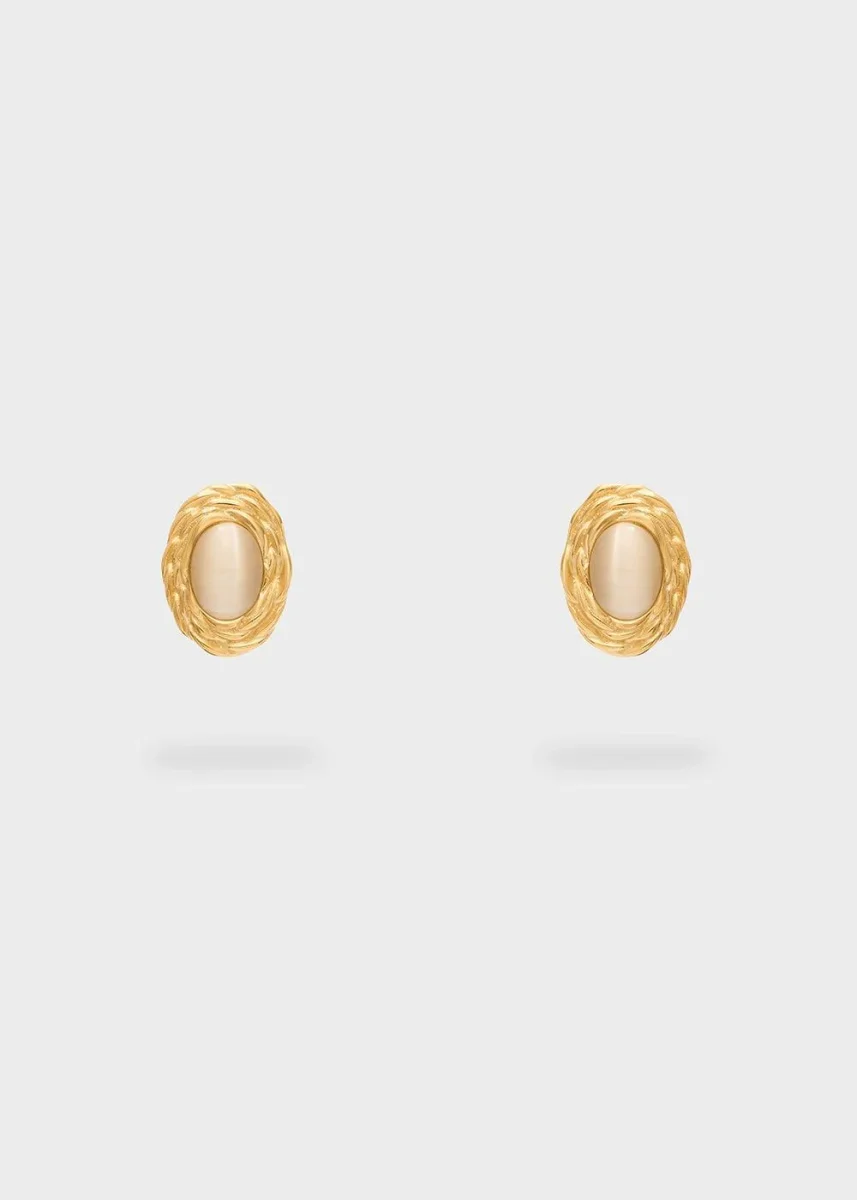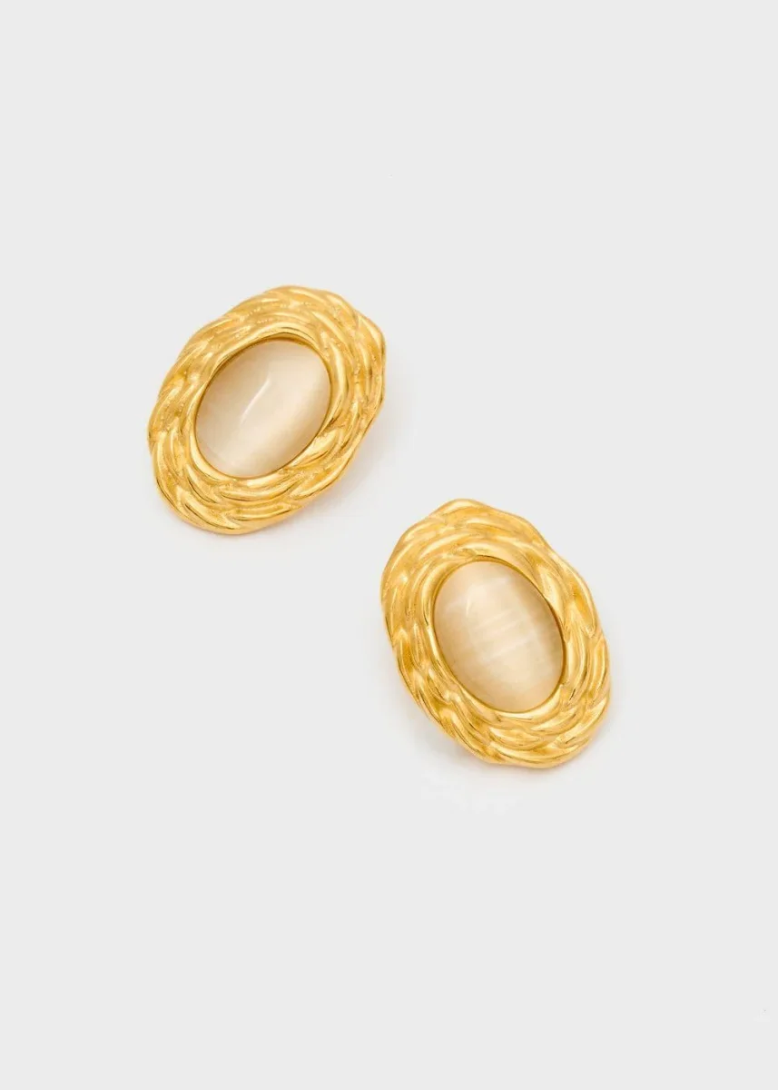 Orecchini a bottone con pietra centrale chiara incastonata in una montatura dorata dal design intrecciato. Raffinati e femminili, perfetti per occasioni speciali.