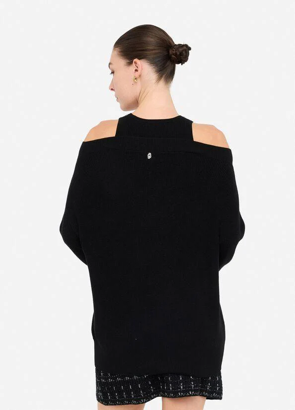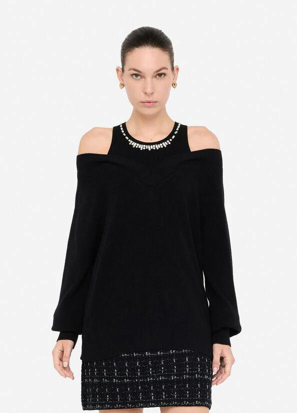 Maglione in misto lana Liu Jo White, scollo a V, inserto ton sur ton con ricami gioiello, maniche lunghe, colore nero