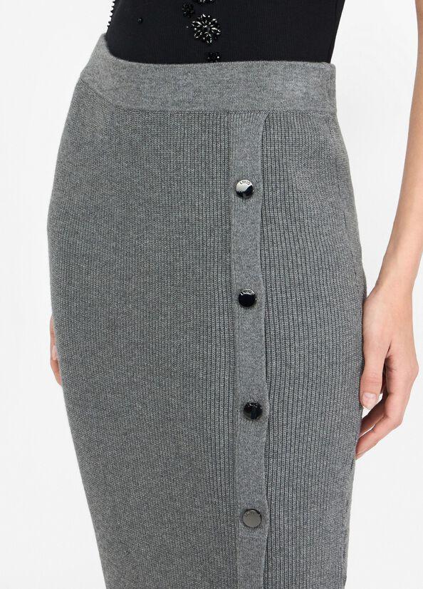 Gonna lunga in maglia a coste inglesi, filati in misto viscosa, bottoni oro, cintone elastico in vita, colore grigio