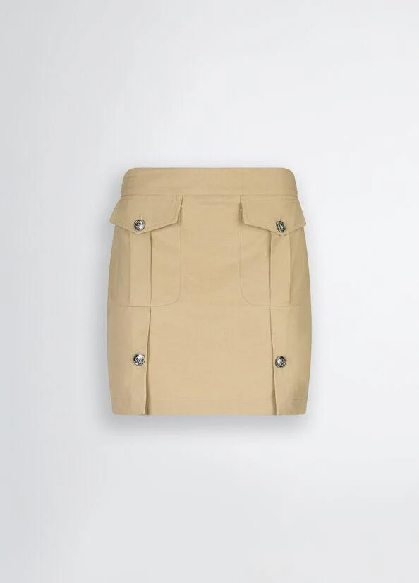 Mini gonna in misto cotone Liu Jo, tasche con patta e bottone sul davanti, etichetta logata in metallo sul retro, chiusura con zip, colore beige