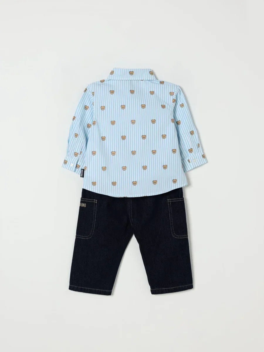 Completino Moschino Kids con camicia e pantalone. Camicia a fantasia in contrasto, colore azzurro. Pantalone blu con logo