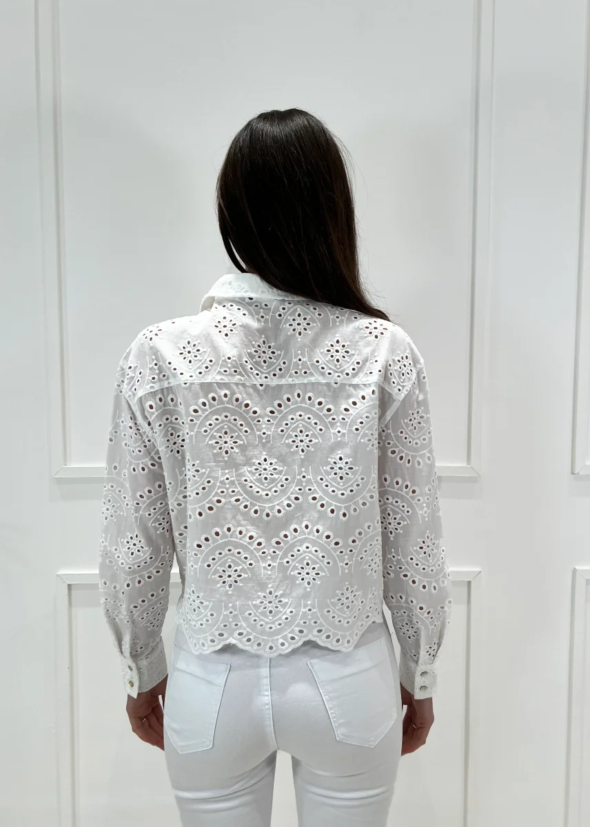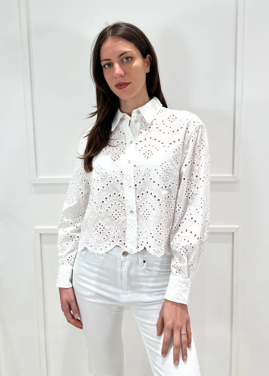 Descrizione: Camicia bianca con motivo traforato a pizzo con disegni floreali, a maniche lunghe e abbottonatura sul davanti con colletto classico.