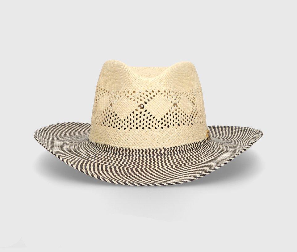 Cappello modello panama Lewis, bicolor e con tesa larga di 8 cm con placchetta logo in ottone