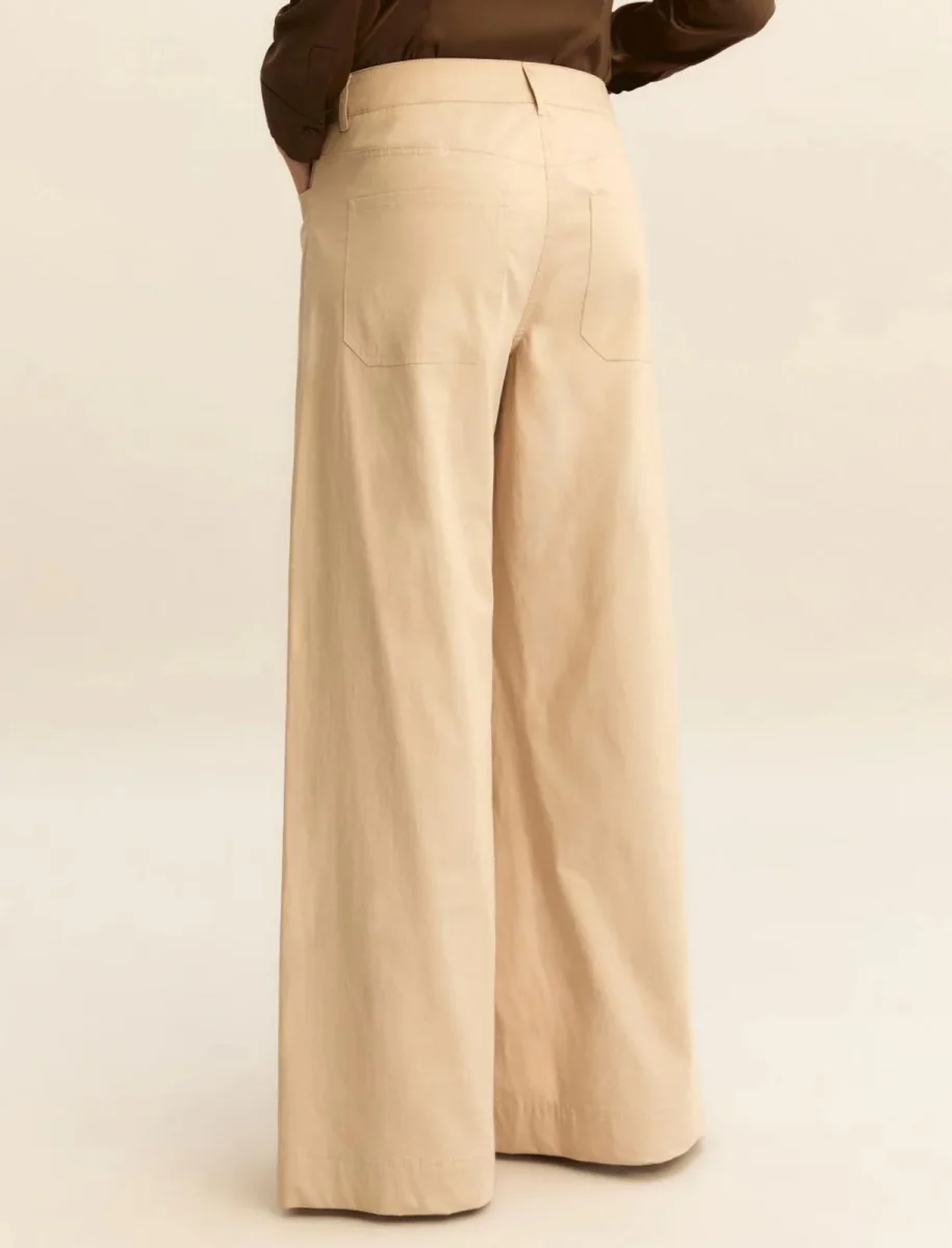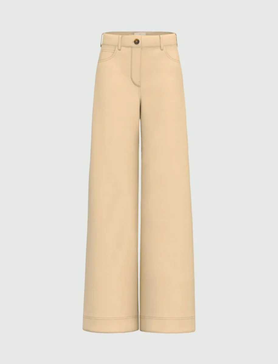 Pantalone Emme Marella, modello in raso stretch smerigliato e lavato, fit ampio, costruzione 5 tasche, chiusura con bottone a vista, passanti in vita, colore beige
