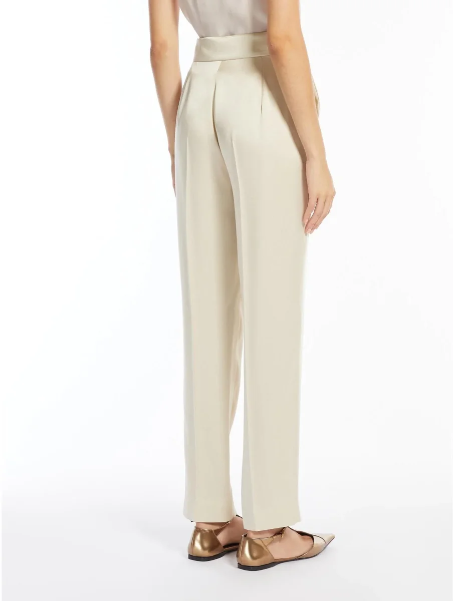 Pantalone a sigaretta in elegante enver satin, caratterizzato da una silhouette con piega stirata e tasche alla francese sui fianchi. Chiusura con listino alto in vita, lampo con patta e gancetto.