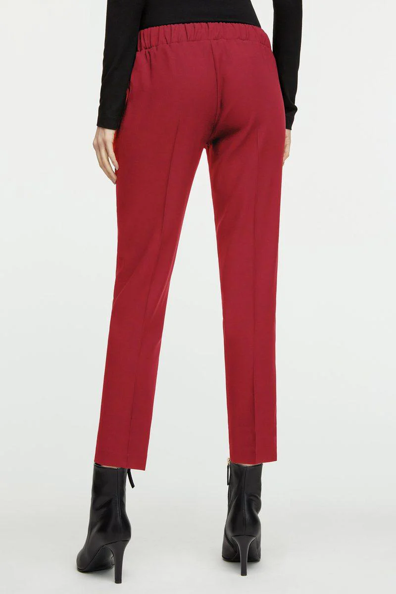 Pantaloni tailored Carla G a vita bassa, elasticizzata dietro in crèpe. Modello a sigaretta con gamba aderente e piega stirata. Tasche alla francese sui fianchi e lunghezza alla caviglia