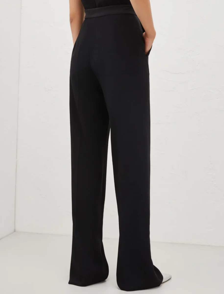 Pantalone Marella art 365, realizzati in morbido crepe envers satin, linea dritta con piega stirata fronte e retro, chiusura con zip invisibile sul fianco, tasche laterali alla francese, colore nero