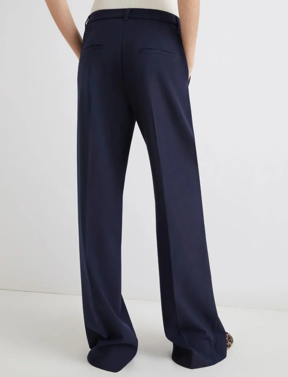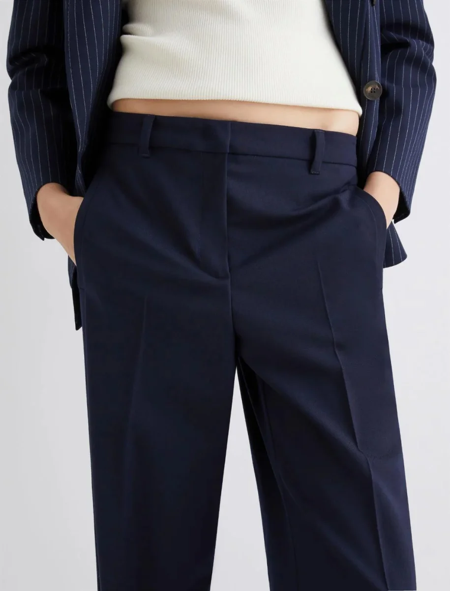 Pantalone in tessuto diagonale in misto lana stretch, chiusura con gancio a uomo e zip frontale, piega stirata fronte e retro, tasche laterali alla francese, colore blu