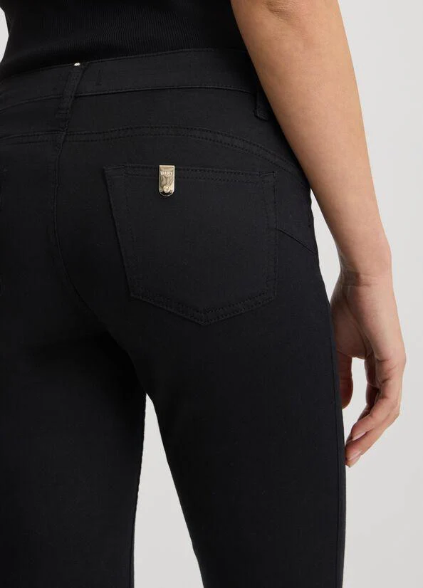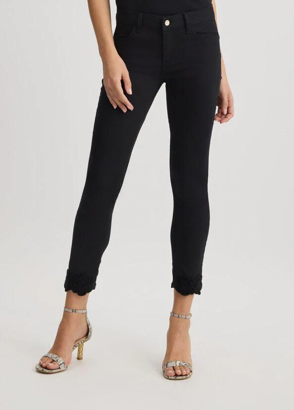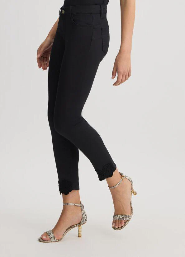 Pantaloni cropped bottom bianchi, realizzati in gabardina di cotone stretch, dettaglio realizzato a mano uncinetto sul fondo, vita regular, gamba skinny, chiusura con bottone e zip nascosta, colore nero