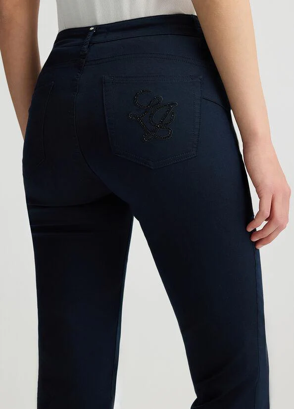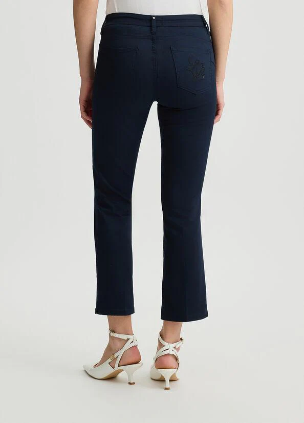 Pantalone cropped bottom up in misto cotone stretch, gamba flare, modello cinque tasche, logo lettering ricamato con strass sul retro, chiusura con bottoni, colore blu