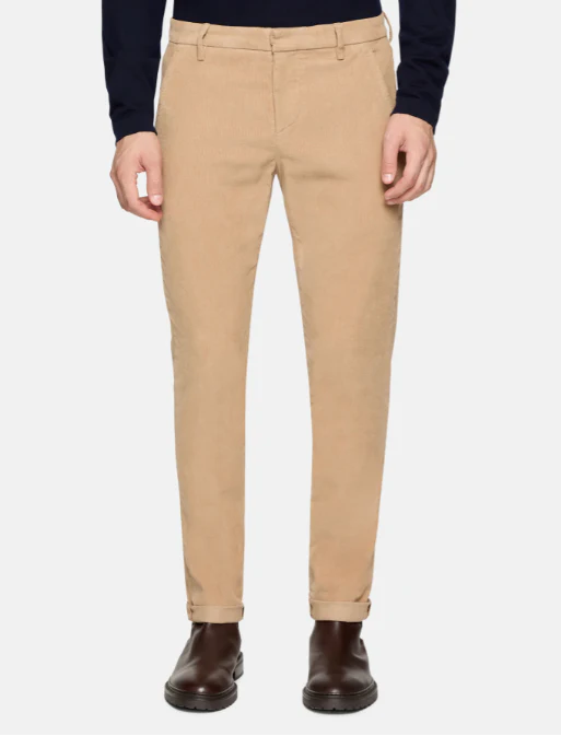 Pantaloni Dondup uomo modello Gaubert slim chino, vita bassa e tasche a filetto posteriori, modello in velluto a coste 1500 righe, color nocciola