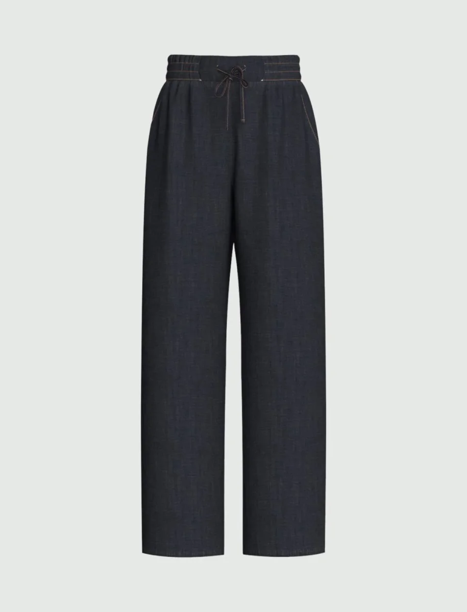 Pantalone in denim stretch, fit ampio, chiusura con cintura elastica e coulisse, tasche laterali alla francese, colore blu