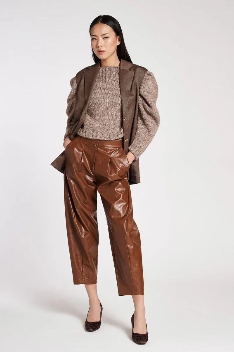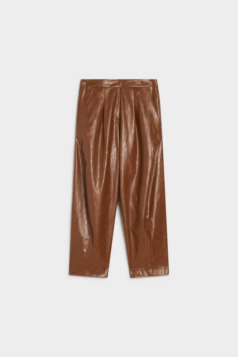 Pantalone ampio in ecopelle stropicciata, vita regolare e cavallo basso, chiusura invisibile con lampo e gencetto in metallo, tasche alla francese, colore marrone