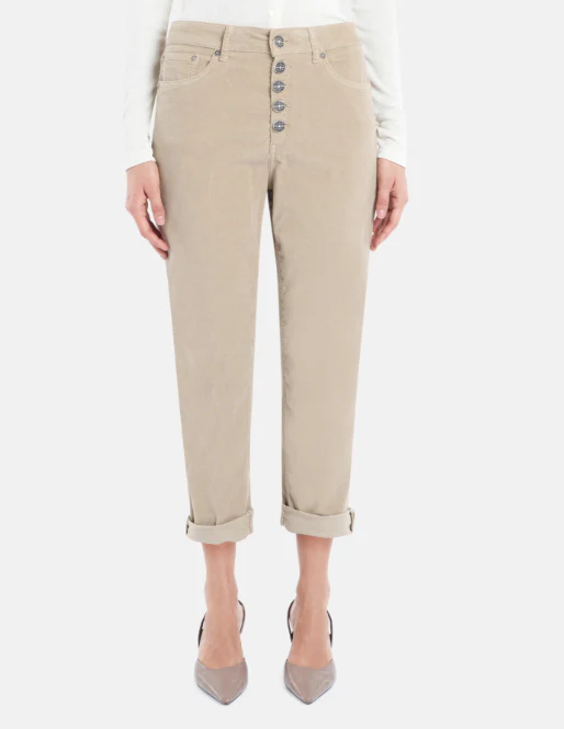 Pantaloni Koons cinque tasche modello loose fit, vita regolare, bottoniera gioiello, lunghezza alla caviglia, realizzato in velluto e cotone, colore beige