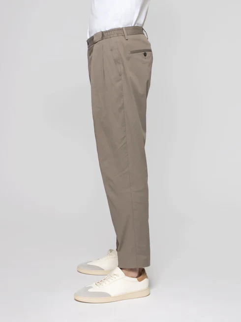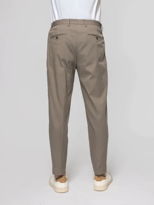 Pantalone Portobello Briglia, modello con doppia pences, chiusura frontale con bottone, tasche america, tasche posteriori a filetto con bottone e passanti in vita, colore tortora