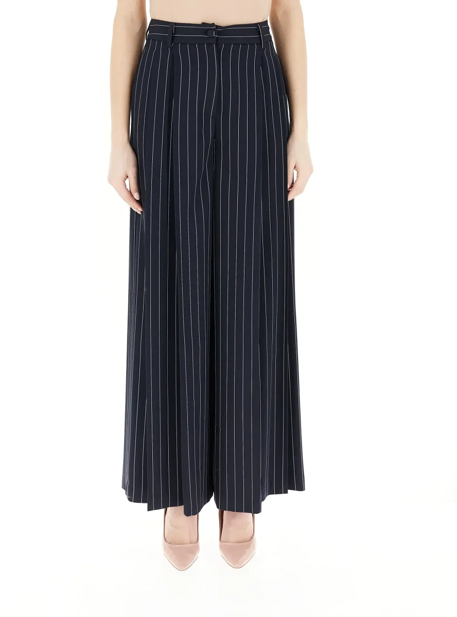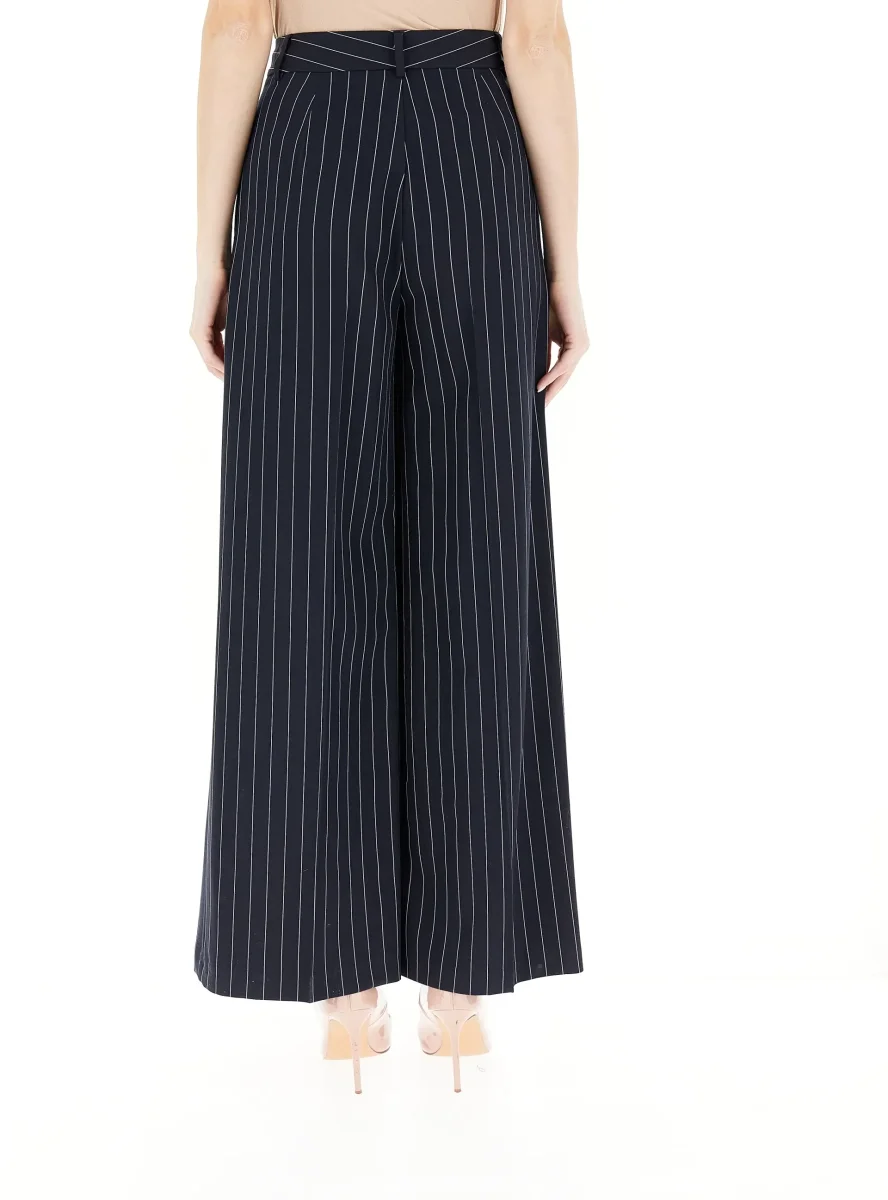 Pantalone a palazzo in misto viscosa, vita con bottone e fantasia a righe in contrasto bicolor, colore blu