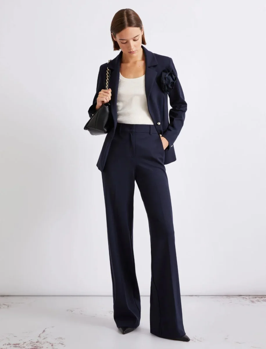 Pantalone slim fit in jersey, modello in misto di viscosa stretch con punto Milano, fit aderente, chiusura con bottone nascosto, tasche laterali alla francese e posteriori a filetto, piega stirata fronte e retro, colore blu