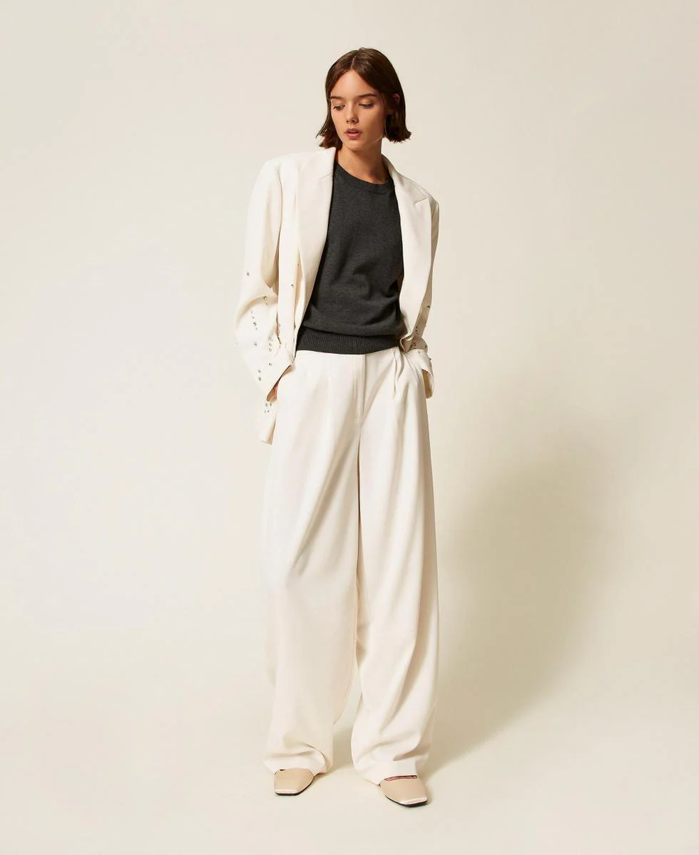 Pantaloni a palazzo Twinset Actitude, modello con pinces e riprese sul ginocchio, chiusura con zip e gancio a uomo, tasche alla francese, placchetta logo, colore bianco