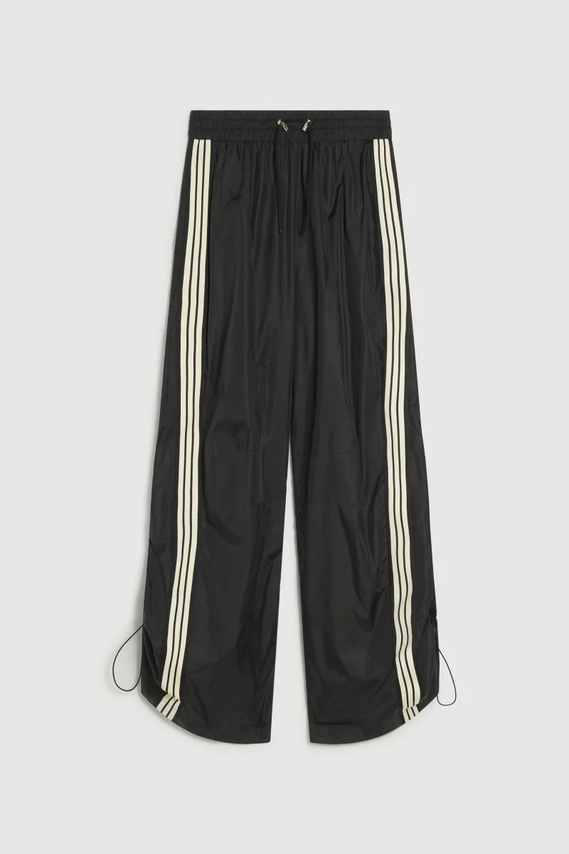 Pantaloni larghi in nylon con vita regolare e cavallo basso, vita elasticizzata con coulisse e fermacorda in metallo, entrata tasca laterale e nastro bicolor