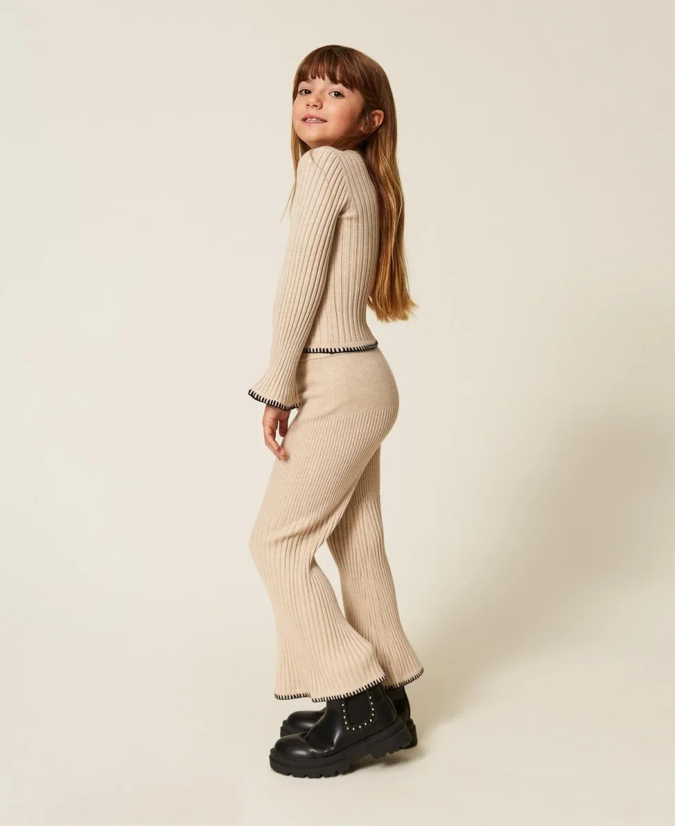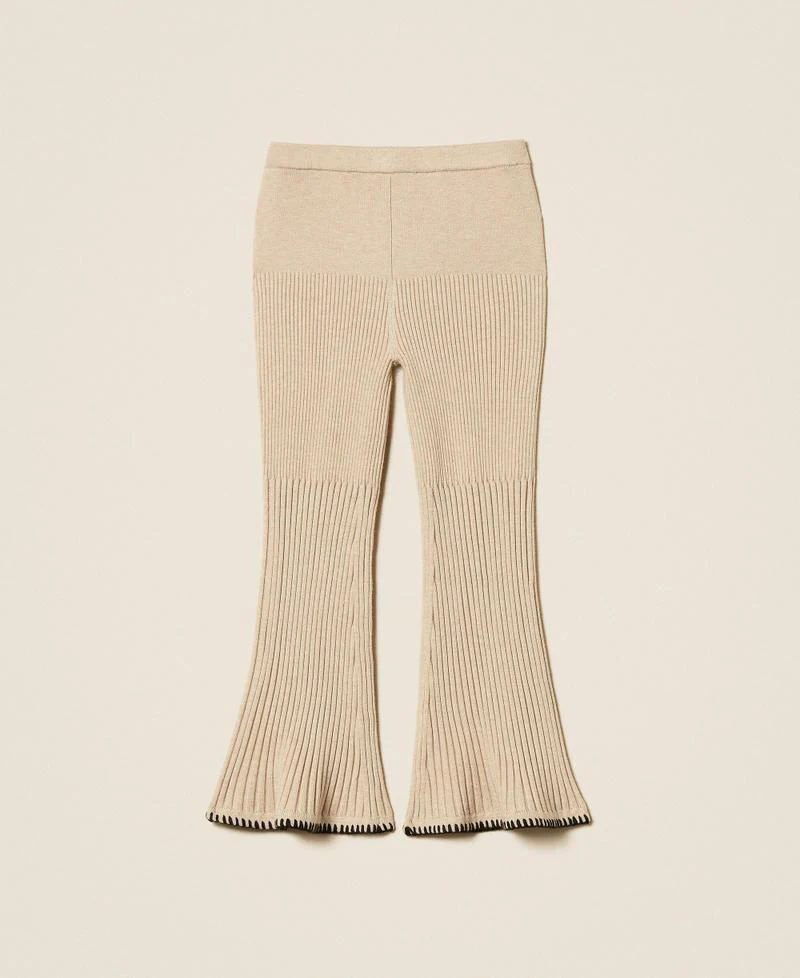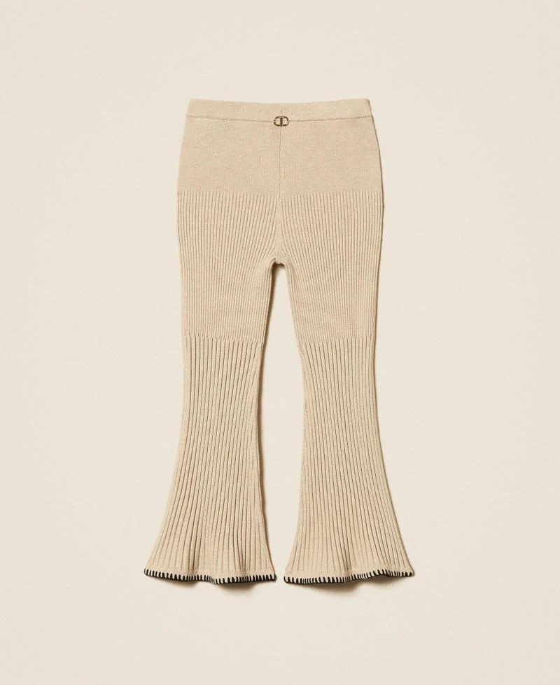 Pantaloni in maglia di misto viscosa Twinset, modello con lavorazione a coste, ricamo a contrasto al fondo, elastico in vita, placchetta logo oval T sul retro, colore beige