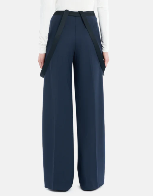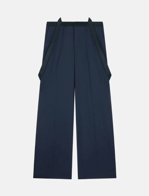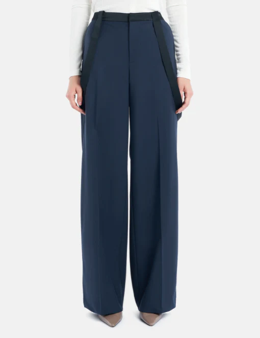 Pantaloni tecla wide leg chino, vita regolabile con bretelli removibili, cinta e bretelle in raso, gabardina di lana stretch, colore blu