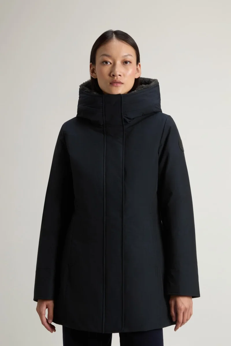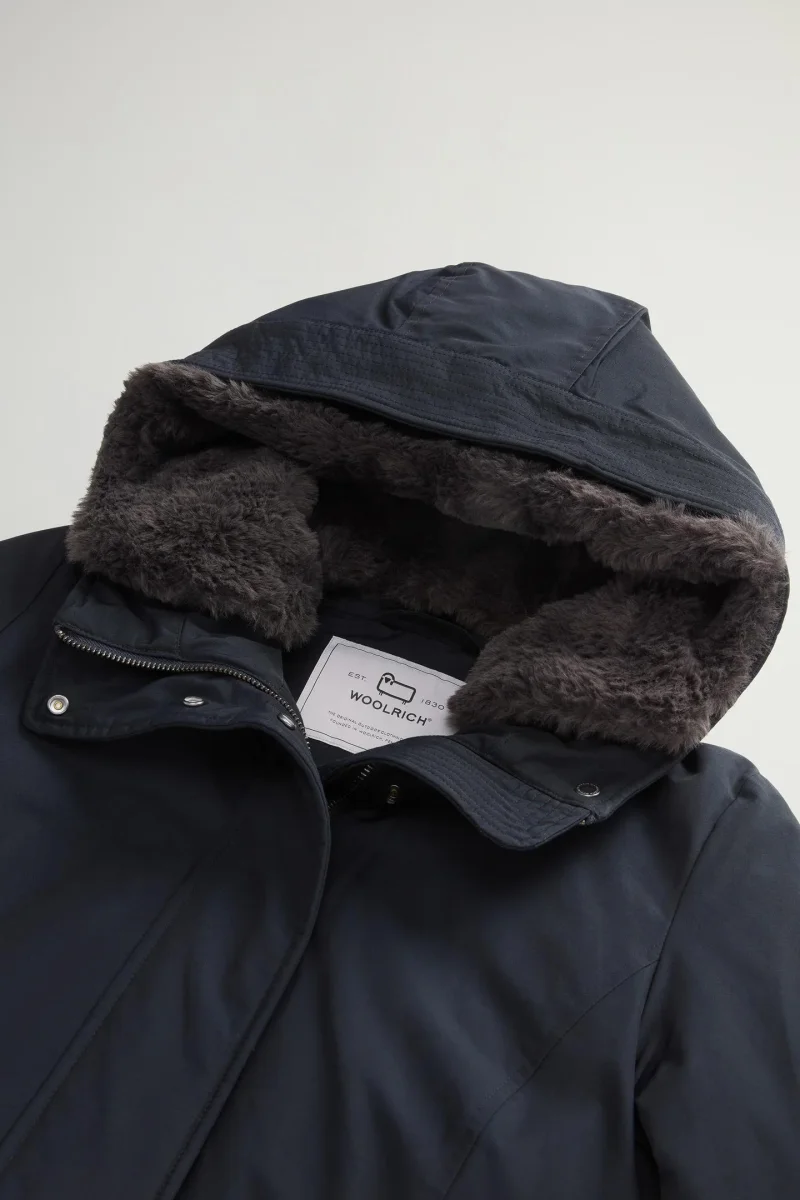 Parka Woolrich in tessuto Ramar Cloth, tessuto idrorepellente resistente al vento, imbottitura in piuma d’anatra 80-20, cappuccio con inserto staccabile in pelle sintetica, chiusura con zip e bottoni nascosta, tasche a filetto con bottoni a pressione, colore blu scuro