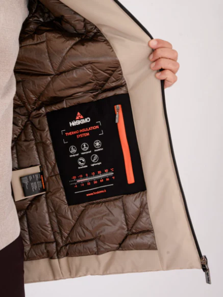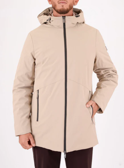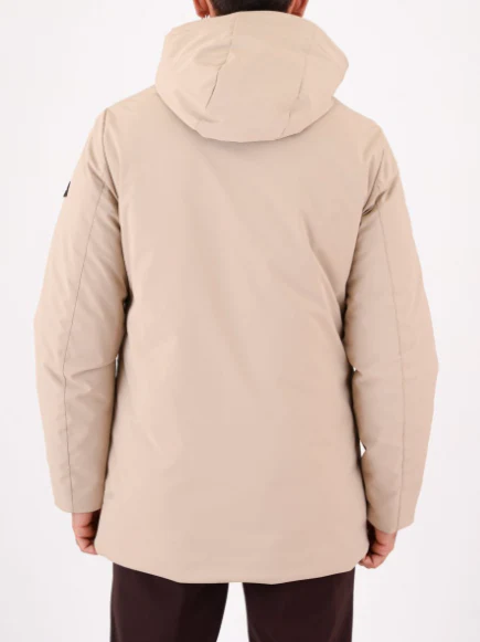 Parka Heskimo realizzato in nylon ed elastan, imbottitura in poliestere, chiusura con zip a doppio cursore, due tasche laterali con chiusura con zip e la patch logo, colore beige