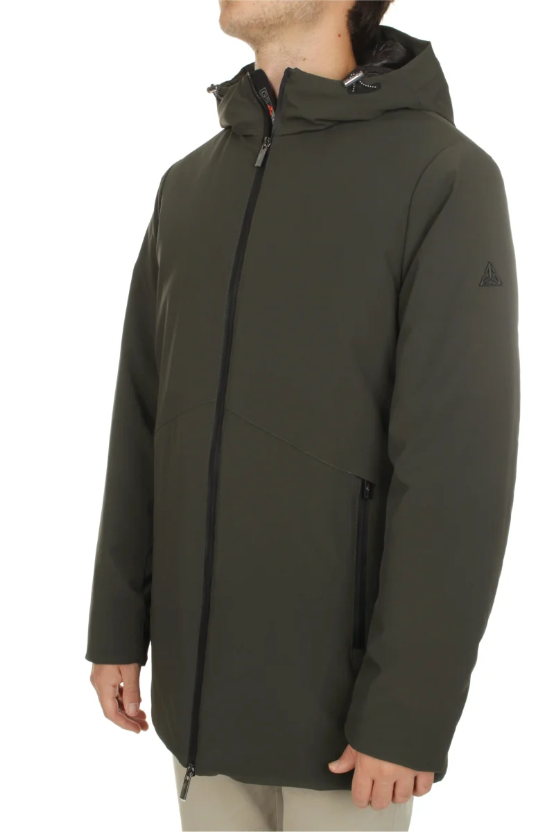 Parka Heskimo realizzato in nylon ed elastan, imbottitura in poliestere, chiusura con zip a doppio cursore, due tasche laterali con chiusura con zip e la patch logo, colore verde