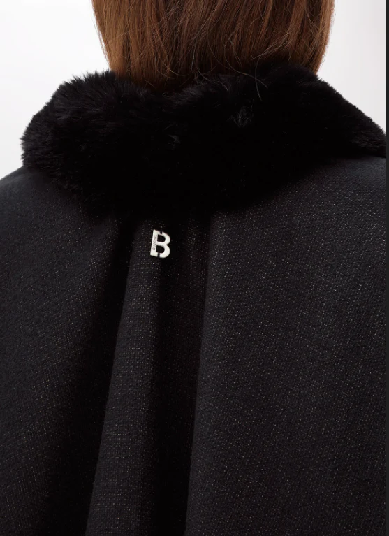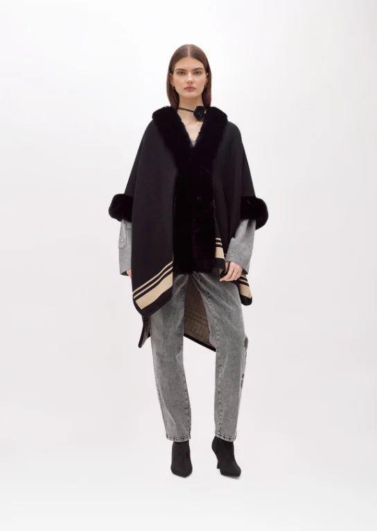 Cappa in maglia Blugirl, profili rifiniti in faux fur, scollo a V, maniche a tre quarti, spacchi laterali e fondo a righe, colore nero