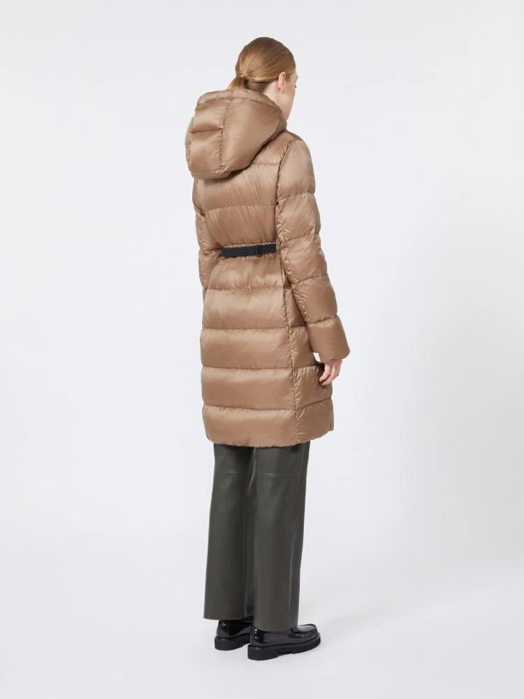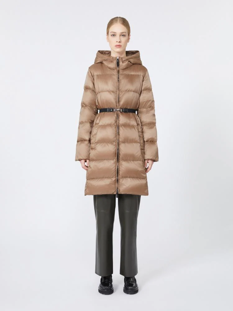 Piumino in tela tecnica antigoccia, modello trapuntato a righe orizzontali, cappuccio e maniche lunghe, chiusura frontale con zip a doppio cursore, tasche con bottoni a pressione, cintura abbinata, colore beige