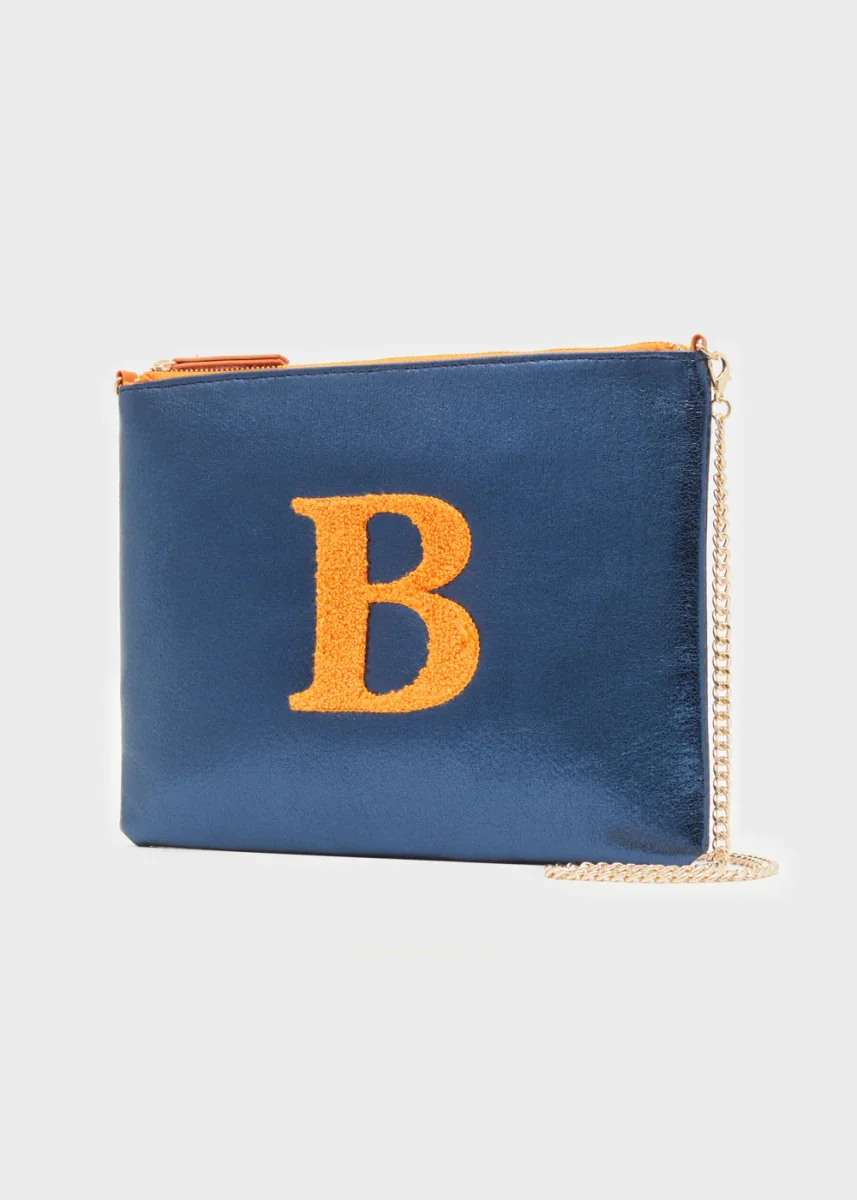 Pochette Nali donna, modello clutch in tessuto metallizzato con patch lettera in contrasto, con comoda catena in contrasto oro, colore blu
