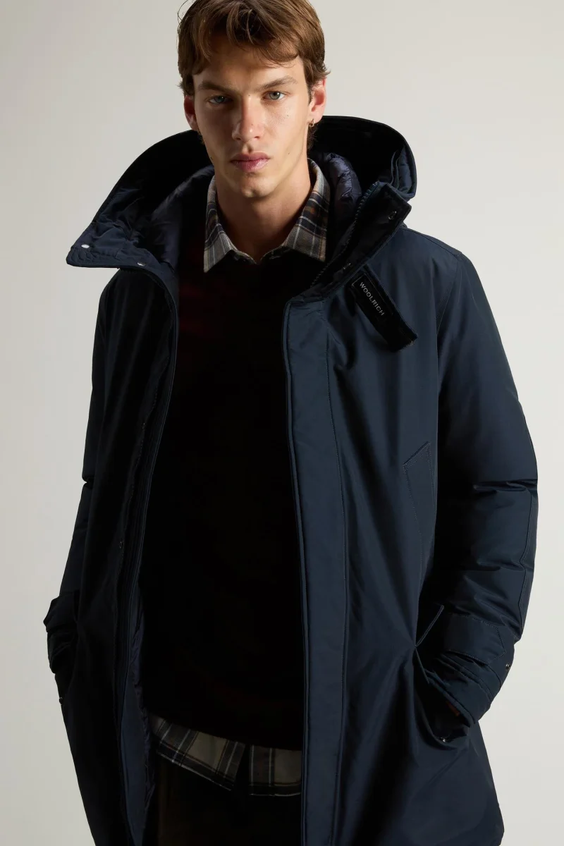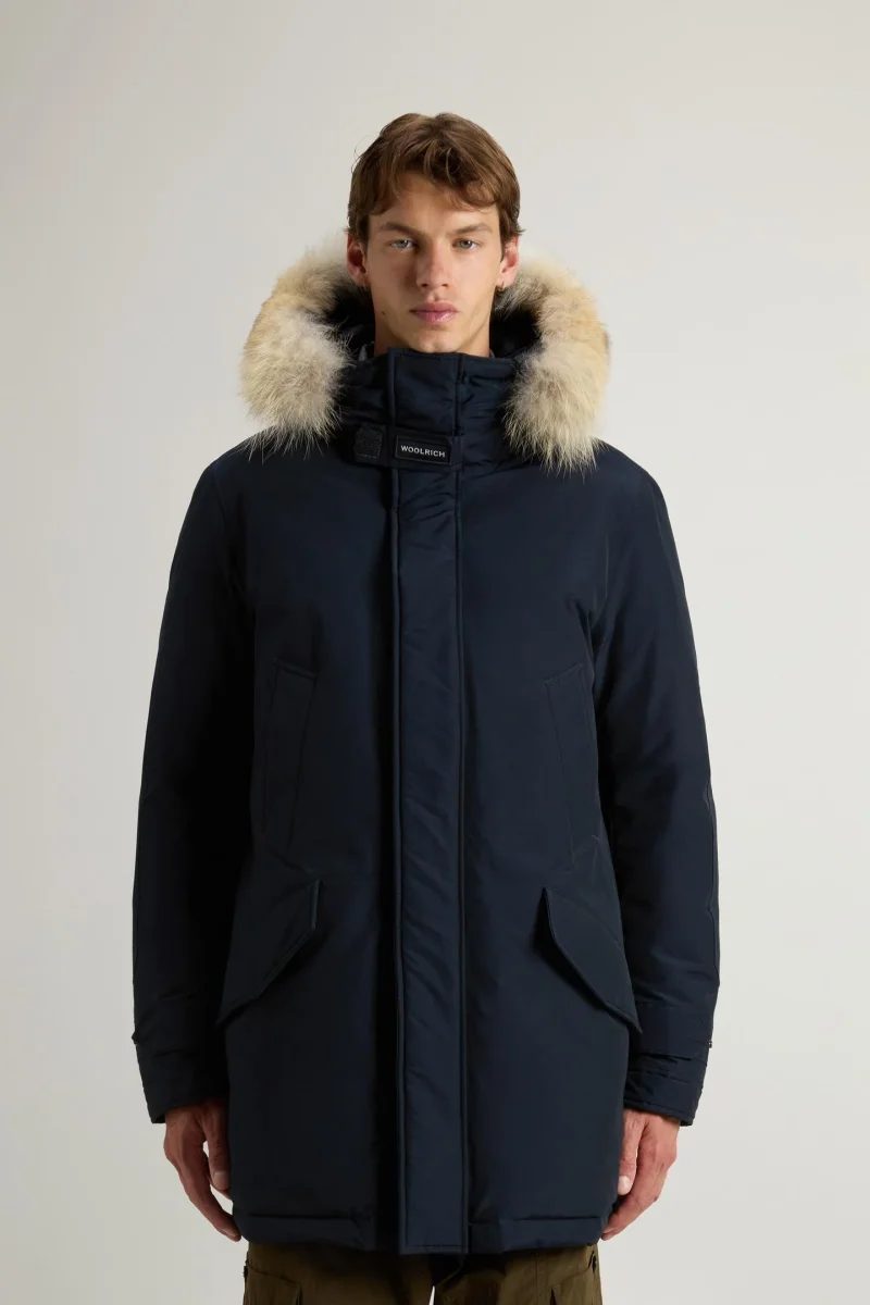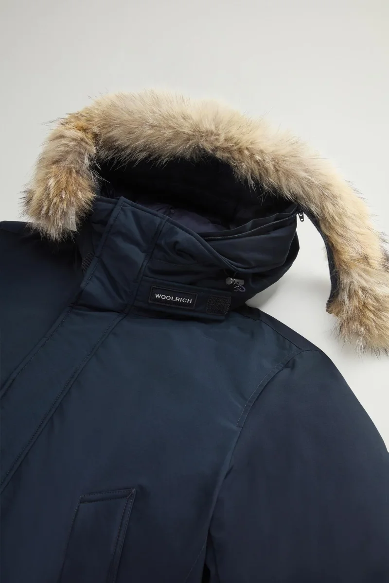 Giubbino Woolrich realizzato in tessuto Ramar Cloth, tessuto idrorepellente e resistente al vento, imbottitura in piuma d’anatra, chiusura con zip nascosta, cappuccio protettivo con inserto di pelliccia rimovibile di coyote, chiusura in velcro, tasche scaldamani, colore blu