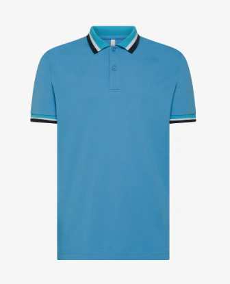 Polo uomo, modello in cotone, maniche corte, chiusura con bottoni e colletto in contrasto, logo ricamato sul petto in contrasto, colore azzurro